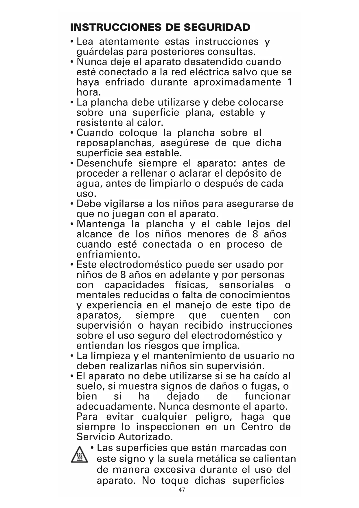 • Nunca toque el cable eléctrico con la suela metálica de la plancha.