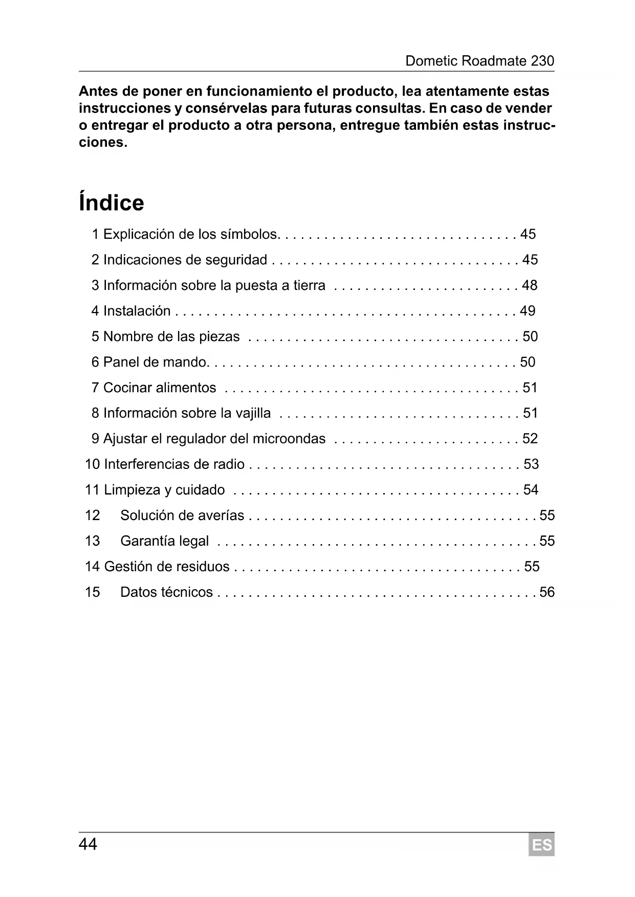 ción por energía microondas.ES Dometic Roadmate 230 Indicaciones de seguridad