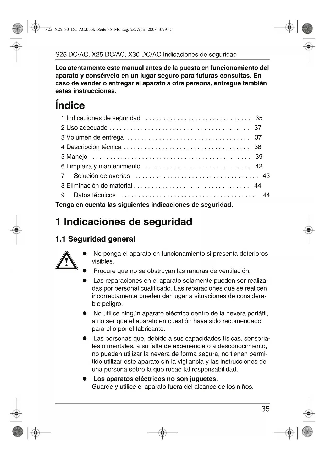 z No ponga el aparato en funcionamiento si presenta deterioros visibles. z Procure que no se obstruyan las ranuras de ventilación. z Las reparaciones en el aparato solamente pueden ser realiza- das por personal cualificado. Las reparaciones que se realicen incorrectamente pueden dar lugar a situaciones de considera- ble peligro. z No utilice ningún aparato eléctrico dentro de la nevera portátil, a no ser que el aparato en cuestión haya sido recomendado para ello por el fabricante. z Las personas que, debido a sus capacidades físicas, sensoria- les o mentales, a su falta de experiencia o a desconocimiento, no pueden utilizar la nevera de forma segura, no tienen permi- tido utilizar este aparato sin la vigilancia y las instrucciones de una persona sobre la que recae tal responsabilidad. z Los aparatos eléctricos no son juguetes. Guarde y utilice el aparato fuera del alcance de los niños. _S25_X25_30_DC-AC.book Seite 35 Montag, 28. April 2008 3:29 15Indicaciones de seguridad S25 DC/AC, X25 DC/AC, X30 DC/AC