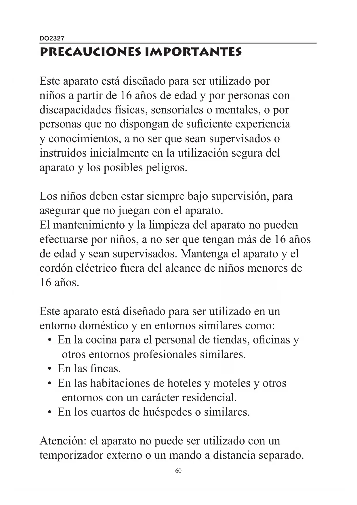 PRECAUCIONES IMPORTANTES Este aparato está diseñado para ser utilizado por niños a partir de 16 años de edad y por personas con discapacidades físicas, sensoriales o mentales, o por personas que no dispongan de suciente experiencia y conocimientos, a no ser que sean supervisados o instruidos inicialmente en la utilización segura del aparato y los posibles peligros. Los niños deben estar siempre bajo supervisión, para asegurar que no juegan con el aparato. El mantenimiento y la limpieza del aparato no pueden efectuarse por niños, a no ser que tengan más de 16 años de edad y sean supervisados. Mantenga el aparato y el cordón eléctrico fuera del alcance de niños menores de 16 años. Este aparato está diseñado para ser utilizado en un entorno doméstico y en entornos similares como: