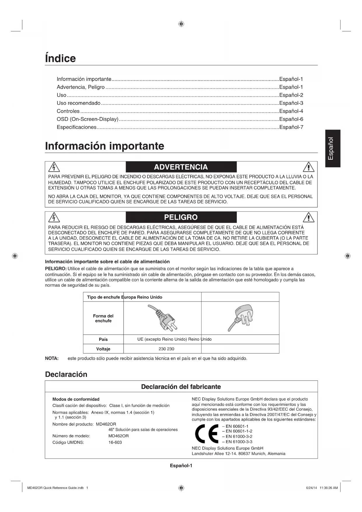 Maße 1055,4 (B) x 608,6 (H) x 69,3 (T) mm / 41,6 (B) x 24,0 (H) x 2,7 (T) Zoll (mit Griff) 1055,4 (B) x 608,6 (H) x 64,5 (T) mm / 41,6 (B) x 24,0 (H) x 2,5 (T) Zoll (ohne Griff) Gewicht 21,4 kg (47.2 lbs) VESA-kompatibler Montageadapter 300 x 300 mm (M6, 4 Löcher) Energiesparfunktion VESA DPM Plug&Play VESA DDC2B, DDC/CI, DisplayPort Stromversorgung für Slot-2-OPTION 16V/3,6 A Zubehör Installationshandbuch, Netzkabel, Videosignalkabel, Fernbedienung, AAA-Batterien (2 Stück), Klemme (1 Stück), Schraube (1 Stück), CD-ROM HINWEIS: Die technischen Daten können ohne vorherige Ankündigung geändert werden. *1: Komprimiertes Bild. *2: Gemeinsamer Anschluss. *3: Wenden Sie sich für ausführliche Informationen an Ihren Händler, wenn Sie Zubehör verwenden möchten, das über den Steckplatz für die Zusatzplatine angeschlossen wird. *4: Angezeigter Text wird möglicherweise unscharf dargestellt. MD462OR Quick Reference Guide.indb 7MD462OR Quick Reference Guide.indb 7 6/24/14 11:36:26 AM6/24/14 11:36:26 AMDeutsch-8 MD462OR Quick Reference Guide.indb 8MD462OR Quick Reference Guide.indb 8 6/24/14 11:36:26 AM6/24/14 11:36:26 AMEspañol-1 Español Índice Información importante .................................................................................................................Español-1 Advertencia, Peligro .....................................................................................................................Español-1 Uso ...............................................................................................................................................Español-2 Uso recomendado ........................................................................................................................Español-3 Controles ......................................................................................................................................Español-4 OSD (On-Screen-Display) ............................................................................................................Español-6 Especifi caciones ...........................................................................................................................Español-7 Información importante PARA PREVENIR EL PELIGRO DE INCENDIO O DESCARGAS ELÉCTRICAS, NO EXPONGA ESTE PRODUCTO A LA LLUVIA O LA HUMEDAD. TAMPOCO UTILICE EL ENCHUFE POLARIZADO DE ESTE PRODUCTO CON UN RECEPTÁCULO DEL CABLE DE EXTENSIÓN U OTRAS TOMAS A MENOS QUE LAS PROLONGACIONES SE PUEDAN INSERTAR COMPLETAMENTE.NO ABRA LA CAJA DEL MONITOR, YA QUE CONTIENE COMPONENTES DE ALTO VOLTAJE. DEJE QUE SEA EL PERSONAL DE SERVICIO CUALIFICADO QUIEN SE ENCARGUE DE LAS TAREAS DE SERVICIO. ADVERTENCIA PARA REDUCIR EL RIESGO DE DESCARGAS ELÉCTRICAS, ASEGÚRESE DE QUE EL CABLE DE ALIMENTACIÓN ESTÁ DESCONECTADO DEL ENCHUFE DE PARED. PARA ASEGURARSE COMPLETAMENTE DE QUE NO LLEGA CORRIENTE A LA UNIDAD, DESCONECTE EL CABLE DE ALIMENTACIÓN DE LA TOMA DE CA. NO RETIRE LA CUBIERTA (O LA PARTE TRASERA). EL MONITOR NO CONTIENE PIEZAS QUE DEBA MANIPULAR EL USUARIO. DEJE QUE SEA EL PERSONAL DE SERVICIO CUALIFICADO QUIEN SE ENCARGUE DE LAS TAREAS DE SERVICIO. PELIGRO Información importante sobre el cable de alimentación PELIGRO: Utilice el cable de alimentación que se suministra con el monitor según las indicaciones de la tabla que aparece a continuación. Si el equipo se le ha suministrado sin cable de alimentación, póngase en contacto con su proveedor. En los demás casos, utilice un cable de alimentación compatible con la corriente alterna de la salida de alimentación que esté homologado y cumpla las normas de seguridad de su país.Tipo de enchufe Europa Reino UnidoForma del enchufe País UE (excepto Reino Unido) Reino UnidoVoltaje230 230 NOTA: este producto sólo puede recibir asistencia técnica en el país en el que ha sido adquirido. Declaración Declaración del fabricante Declaración del fabricante Modos de conformidadClasifi cación del dispositivo: Clase I, sin función de mediciónNormas aplicables: Anexo IX, normas 1.4 (sección 1) y 1.1 (sección 3)Nombre del producto: MD462OR 46" Solución para salas de operacionesNúmero de modelo: MD462ORCódigo UMDNS: 16-603NEC Display Solutions Europe GmbH declara que el producto aquí mencionado está conforme con los requerimientos y las disposiciones esenciales de la Directiva 93/42/EEC del Consejo, incluyendo las enmiendas a la Directiva 2007/47/EC del Consejo y cumple con los apartados aplicables de los siguientes estándares: – EN 60601-1 – EN 60601-1-2 – EN 61000-3-2 – EN 61000-3-3NEC Display Solutions Europe GmbHLandshuter Allee 12-14. 80637 Munich, Alemania MD462OR Quick Reference Guide.indb 1MD462OR Quick Reference Guide.indb 1 6/24/14 11:36:26 AM6/24/14 11:36:26 AMEspañol-2 Uso La solución para salas de operaciones MD462OR se ha concebido para que los médicos puedan revisar las imágenes médicas. MD462OR no puede utilizarse en sistemas de apoyo vital. Medida de seguridad Esta unidad se ha diseñado para interconectarse exclusivamente con equipos certifi cados IEC60950 fuera del entorno del paciente y con equipos certifi cados IEC 60601-1 en el entorno del paciente.