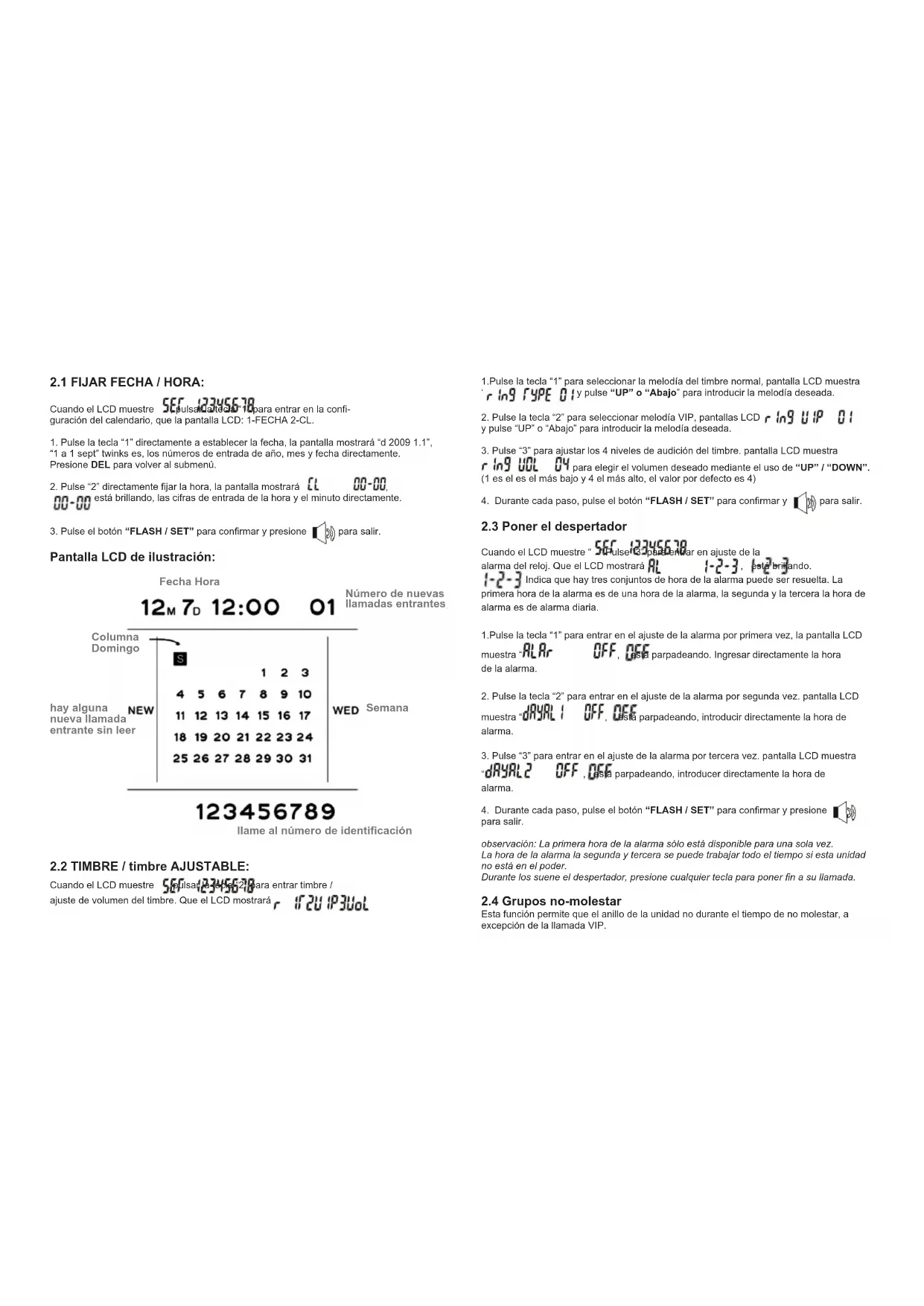 Durante el modo de ajuste, presione FLASH / SET para entrar. pantalla LCD muestra al nalizar cada tema, presione FLASH / SET de nuevo para conrmar o presione la tecla DEL para volver al submenú, pulse “ ” para salir. volver a llamarhaciaarribaexcurso número de teléfonohacia atrásUn toquememoria M1Un toquememoria M2Un toquememoria M3Clave de memoriavolver a marcar / pausacalculadoravolumen / VIPborrarmúsica en esperamanos libres BIG 300 User manual 11x15_8giu.indd 36-37 13/06/12 11.262.1 FIJAR FECHA / HORA: Cuando el LCD muestre , pulsar la tecla “1” para entrar en la con- guración del calendario, que la pantalla LCD: 1-FECHA 2-CL.