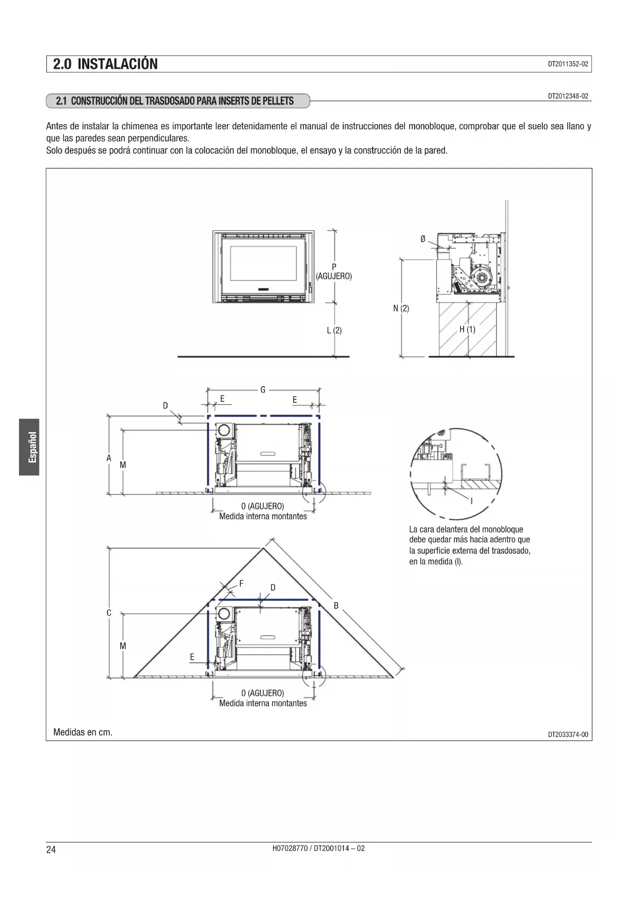 Las distancias indicadas son las minimas necessarias para la instalacion en paredes no inflamables. En caso de paredes inflamables, siga lasindicaciones del manual de uso ymantimiento del monobloque, en el apartado "DISTANCIAS MINIMAS DE SEGURIDAD".