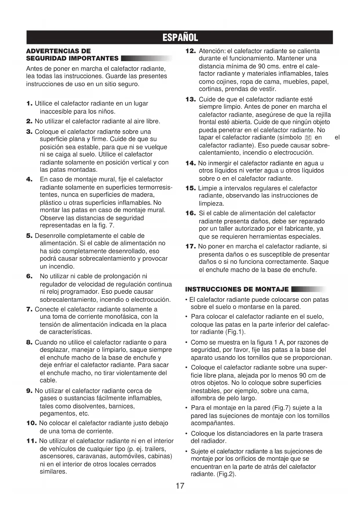 ESPAÑOL ADVERTENCIAS DE SEGURIDAD IMPORTANTES Antes de poner en marcha el calefactor radiante,