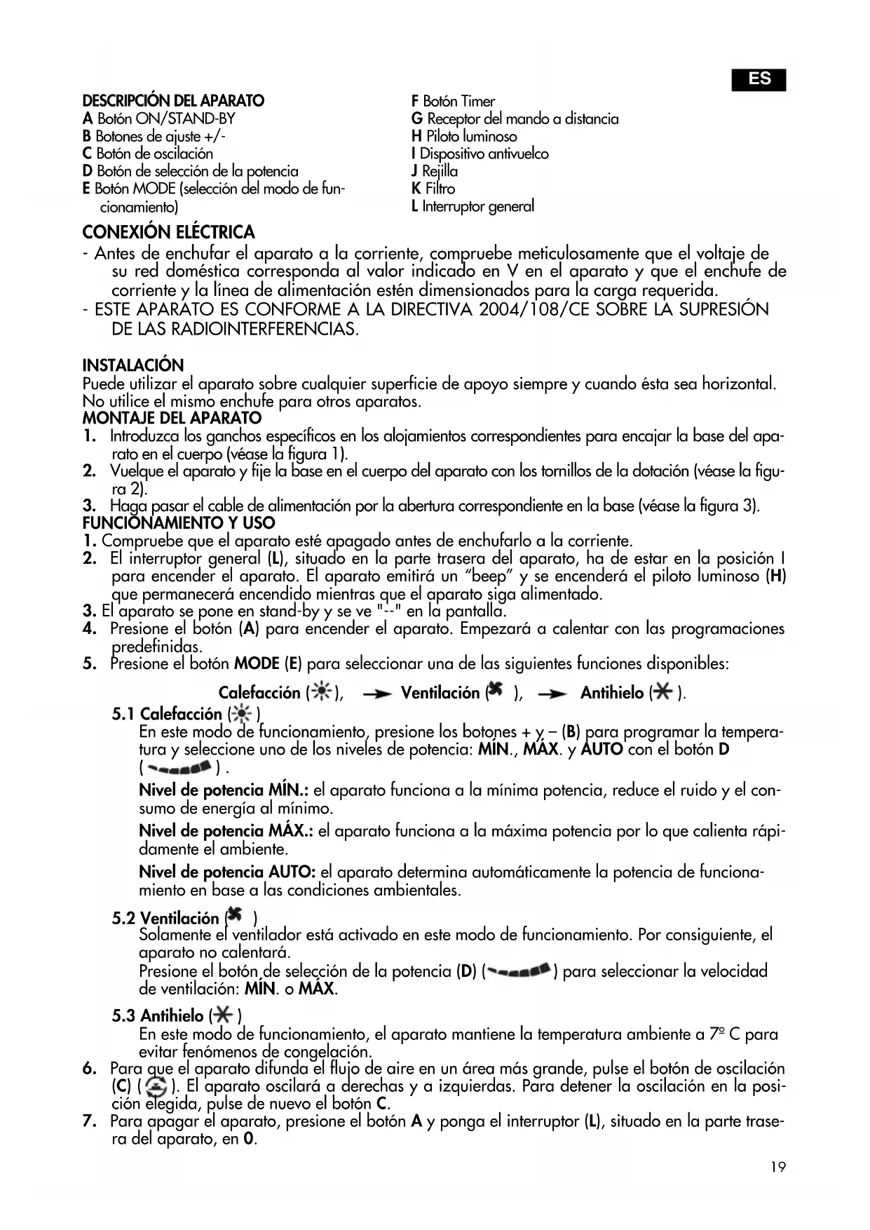 - El interruptor general (L), situado en la parte trasera del aparato, ha de estar en la posicion I para encender el aparato. El aparato emitirá un "beep" y se encenderá el piloto luminoso (H) que permanecerá encendido cuando que el aparato siga alimentado.
