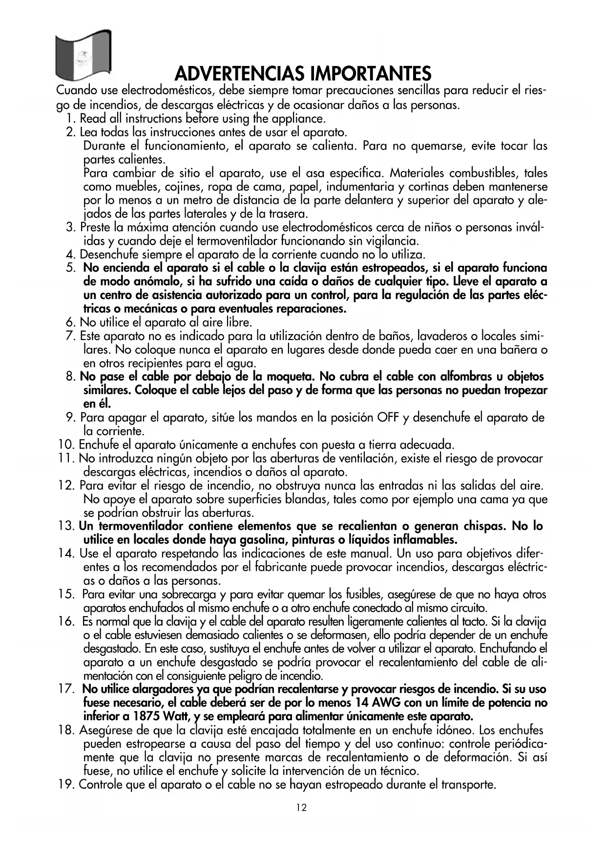 17. No utilice alargadores ya que podrían recalentarse y provocar riesgos de incendio. Si su uso