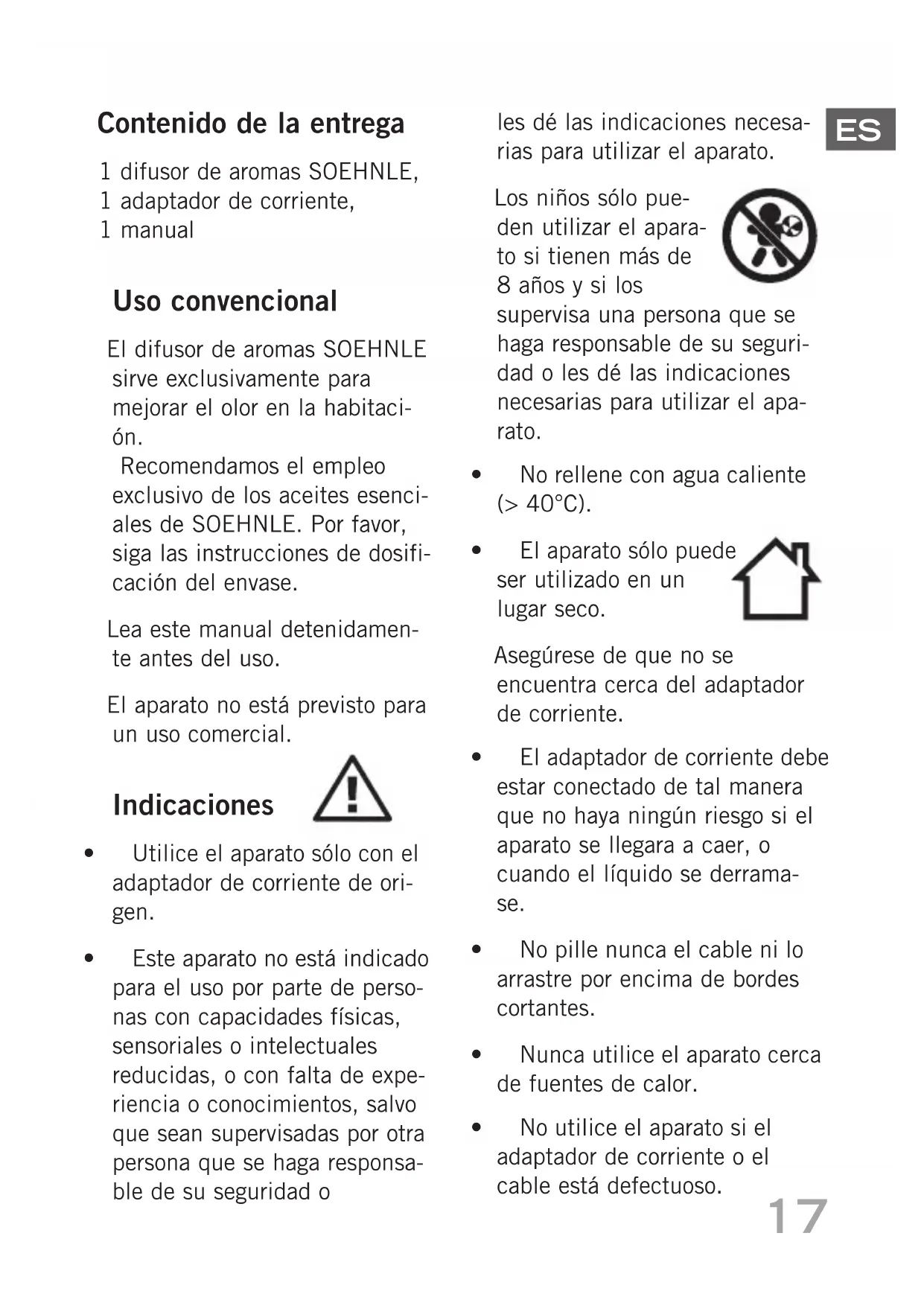 Uso convencional El difusor de aromas SOEHNLE sirve exclusivamente para mejorar el olor en la habitaci- ón. Recomendamos el empleo exclusivo de los aceites esenci- ales de SOEHNLE. Por favor, siga las instrucciones de dosifi- cación del envase. Lea este manual detenidamen- te antes del uso. El aparato no está previsto para un uso comercial.
