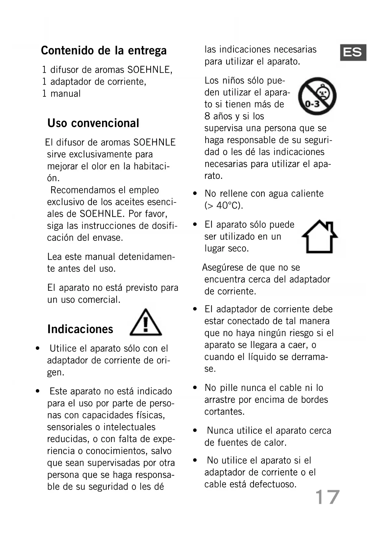 Uso convencional El difusor de aromas SOEHNLE sirve exclusivamente para mejorar el olor en la habitaci- ón. Recomendamos el empleo exclusivo de los aceites esenci- ales de SOEHNLE. Por favor, siga las instrucciones de dosifi- cación del envase.