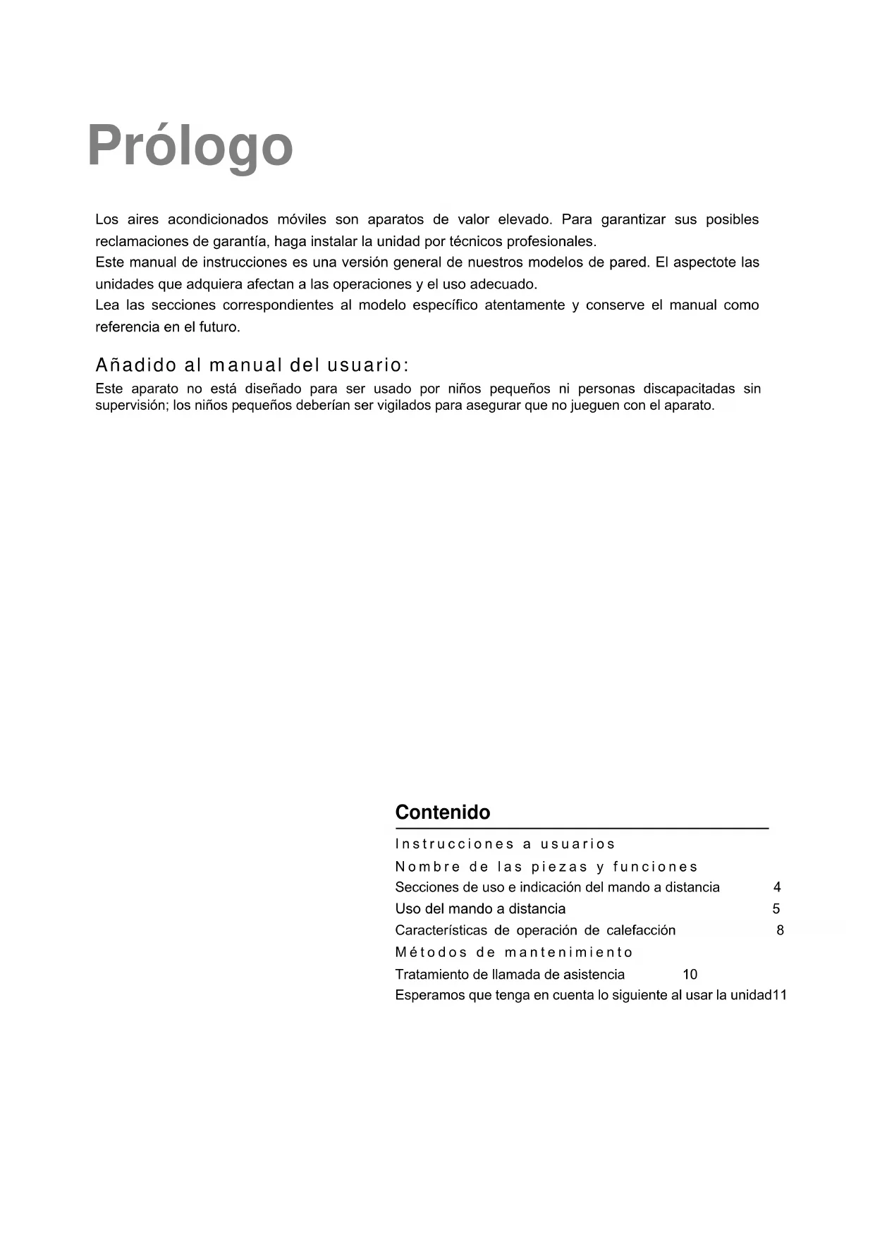 Contenido Instrucciones a usuarios 1 Nombre de las piezas y funciones 3 Secciones de uso e indicación del mando a distancia 4 Uso del mando a distancia 5 Características de operación de calefacción 8Métodos de mantenimiento 9Tratamiento de llamada de asistencia 10 Esperamos que tenga en cuenta lo siguiente al usar la unidad11 Prólogo【