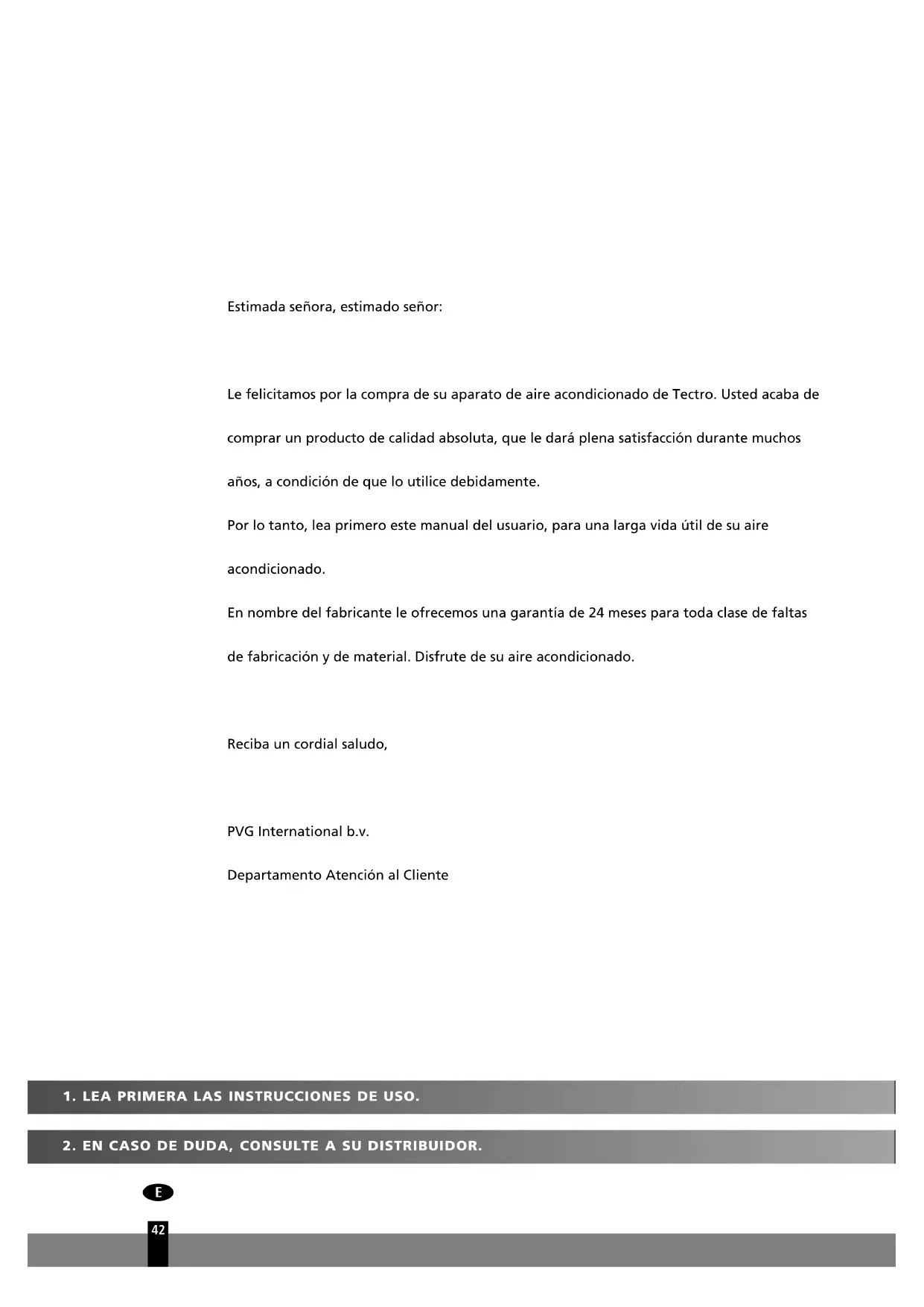 Estimada señora, estimado señor: Le felicitamos por la compra de su aparato de aire acondicionado de Tectro. Usted acaba de comprar un producto de calidad absoluta, que le dará plena satisfacción durante muchos años, a condición de que lo utilice debidamente. Por lo tanto, lea primero este manual del usuario, para una larga vida útil de su aire acondicionado. En nombre del fabricante le ofrecemos una garantía de 24 meses para toda clase de faltas de fabricación y de material. Disfrute de su aire acondicionado. Reciba un cordial saludo, PVG International b.v. Departamento Atención al Cliente man_TSC126_es.qxd 10-05-2007 15:32 Pagina 425