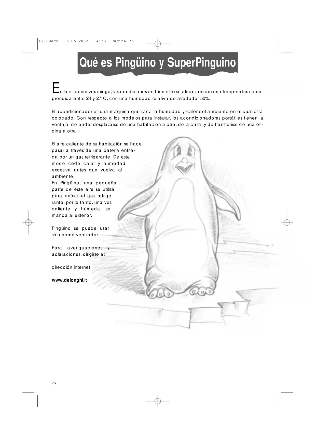 GEBRUIKSOMSTANDIGHEDEN Temperatuur van kamer 21 ÷ 32°C Buiten temperatuur 21 ÷ 43°C FX180eco 16-05-2002 14:53 Pagina 7576 En la estación veraniega, las condiciones de bienestar se alcanzan con una temperatura com- prendida entre 24 y 27°C, con una humedad relativa de alrededor 50%. El acondicionador es una máquina que saca la humedad y calor del ambiente en el cual está colocado. Con respecto a los modelos para instalar, los acondicionadores portátiles tienen la ventaja de poder desplazarse de una habitación a otra, de la casa, y de transferirse de una ofi- cina a otra. El aire caliente de su habitación se hace pasar a través de una batería enfria- da por un gas refrigerante. De este modo cede calor y humedad excesiva antes que vuelva al ambiente. En Pingüino, una pequeña parte de este aire se utiliza para enfriar el gas refrige- rante, por lo tanto, una vez caliente y húmeda, se manda al exterior. Pingüino se puede usar sólo como ventilador. Para averiguaciones y aclaraciones, dirigirse a: dirección internet www.delonghi.it Qué es Pingüino y SuperPinguino FX180eco 16-05-2002 14:53 Pagina 76ESPAÑOL