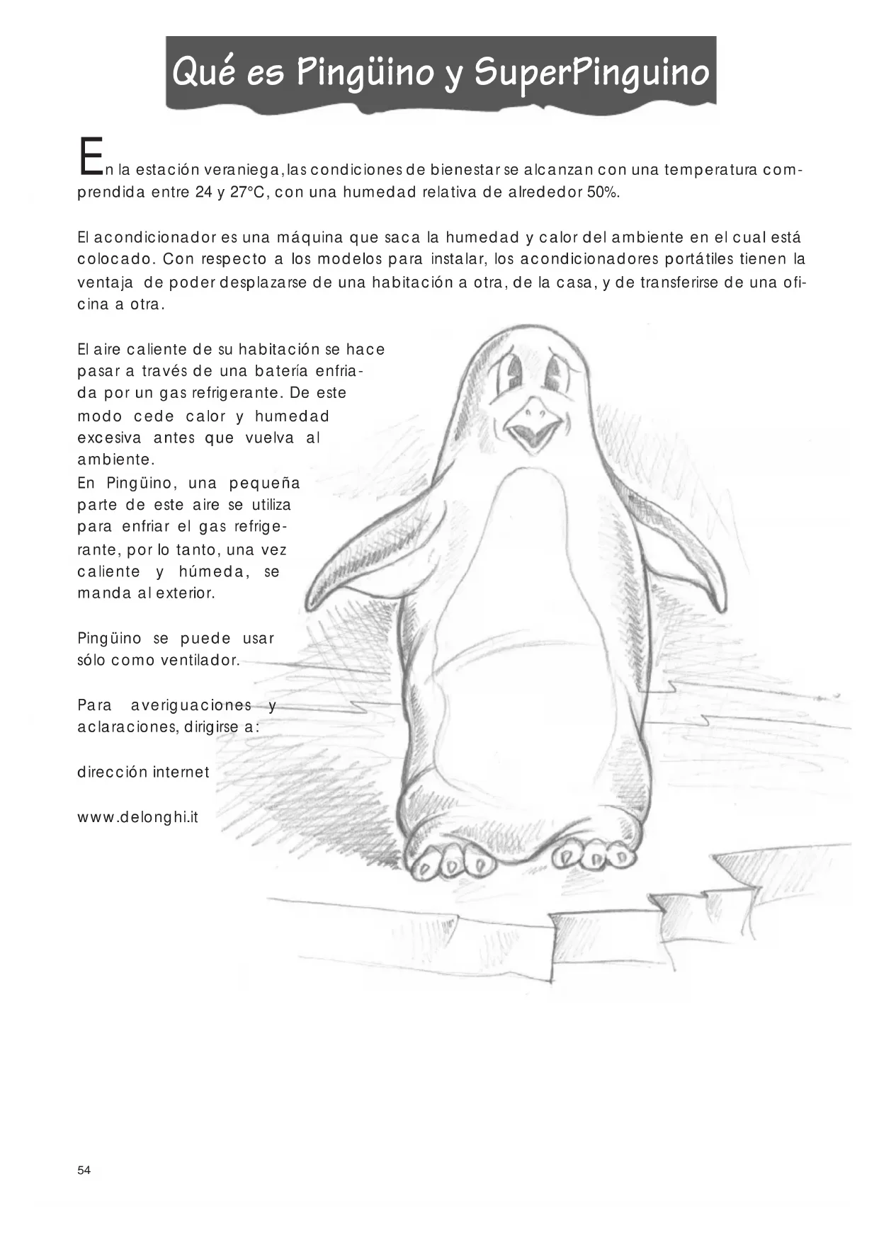 Le agradecemos por haber elegido un producto De Longhi, cider mundial en la fabricacion de los acondicionadores portátiles. Años de experiencia en todo el mundo nos permiten mejor Constantemente la calidad y las prestaciones de Pinguino. Estamos seguros que quedará inmediamente satisfecho de su compra y que gozará por largo tiempo el fresco bienestar que da Pinguino. Le pedimos que dedique un poco de su tiempo a la lectureura de este manual de instrucciones y de guardarlo con cuidado. De este modo,oulda usar Pinguino en conditiones de maxima eficacia y serenidad.