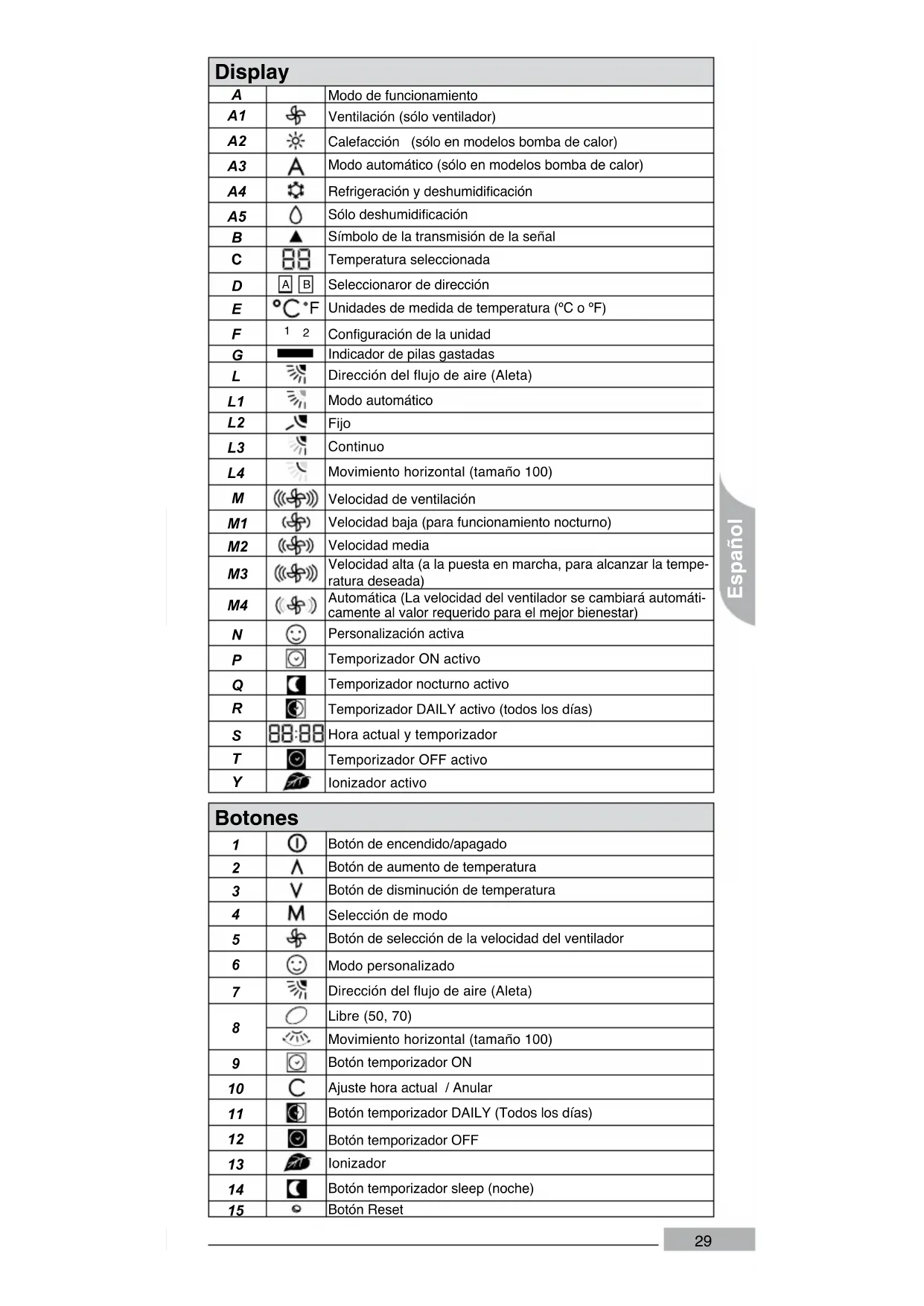 Botón de encendido/apagado Botón de aumento de temperatura Botón de disminución de temperatura Selección de modo Botón de selección de la velocidad del ventilador Modo personalizado Dirección del flujo de aire (Aleta) Libre (50, 70)Movimiento horizontal (tamaño 100) Botón temporizador ON Ajuste hora actual / Anular Botón temporizador DAILY (Todos los días) Botón temporizador OFF Ionizador Botón temporizador sleep (noche) Botón Reset Español31