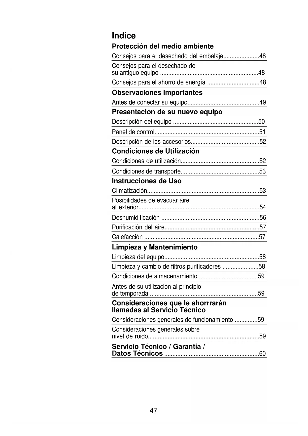Protección del medio ambiente Consejos para el desechado del embalaje ❏ Respete el medio ambiente al tirar el embalaje de su equipo. ❏ Nuestros productos se embalan cuidadosamente para el transporte. Todos los materiales utilizados en el embalaje son respetuosos con el medio ambiente (los cartones se obtienen a partir de papel usado) y pueden ser reciclados. ❏ Reciclando el embalaje, contribuye por una parte a un menor consumo de materias primas, y por otra, a reducir el volumen de los vertederos. ❏ Contribuya de forma efectiva a la protección del medio ambiente mediante la correcta gestión del embalaje, para ello, lleve el mismo hasta el punto limpio de recogida que su ayuntamiento haya colocado más próximo o si se lo admite, Vd. puede devolver el embalaje al comerciante que le ha facilitado el equipo. Consejos para el desechado de su antiguo equipo ❏ Desenchufe el equipo de la red y corte el cable de conexión. ❏ Los equipos incorporan materiales reciclables que se pueden recuperar, además de materiales peligrosos (como metales pesados o fluidos refrigerantes) que pueden producir contaminación del suelo o la atmósfera. Contribuya activamente a la protección del medio ambiente asegurando que su viejo equipo sea desguazado de modo respetuoso con el medio ambiente, para ello, entregue el equipo en un centro oficial de recogida o recuperación de materiales (su ayuntamiento le informará del punto limpio de recogida más próximo). Los equipos contienen refrigerantes que han de eliminarse de acuerdo con la normativa vigente. ❏ Este aparato cumple con la Directiva europea 2002/96/CE sobre aparatos eléctricos y electrónicos identificada como (Residuos de aparatos eléctricos y electrónicos). La directiva proporciona el marco general válido en todo el ámbito de la Unión Europea para la retirada y la reutilización de los residuos de los aparatos eléctricos y electrónicos. Consejos para el ahorro de energía Durante la etapa de uso, su equipo consume energía, lo que genera un impacto medioambiental. Se debe intentar mejorar la eficiencia del equipo y por tanto reducir el consumo. ❏ Apague el equipo de aire cuando no lo necesite. ❏ Elija una temperatura idónea, temperaturas demasiado bajas conllevan un alto consumo de energía. ❏ Coloque el equipo en un lugar alejado de posibles fuentes de calor (radiación solar, etc.) y con una buena circulación del aire. ❏ Asegúrese de la correcta instalación del equipo. Se puede conseguir reducir el consumo de energía hasta en un 30%, reduciendo la entrada de calor en la habitación mediante el uso de toldos, persianas o cortinas en aquellas superficies acristaladas. ❏ Utilice los accesorios que incluye su equipo así como los específicos que se describen en el apartado "Descripción de los accesorios" para minimizar el paso de aire exterior a la habitación. En caso de utilización de accesorios que requieran deObservaciones Importantes