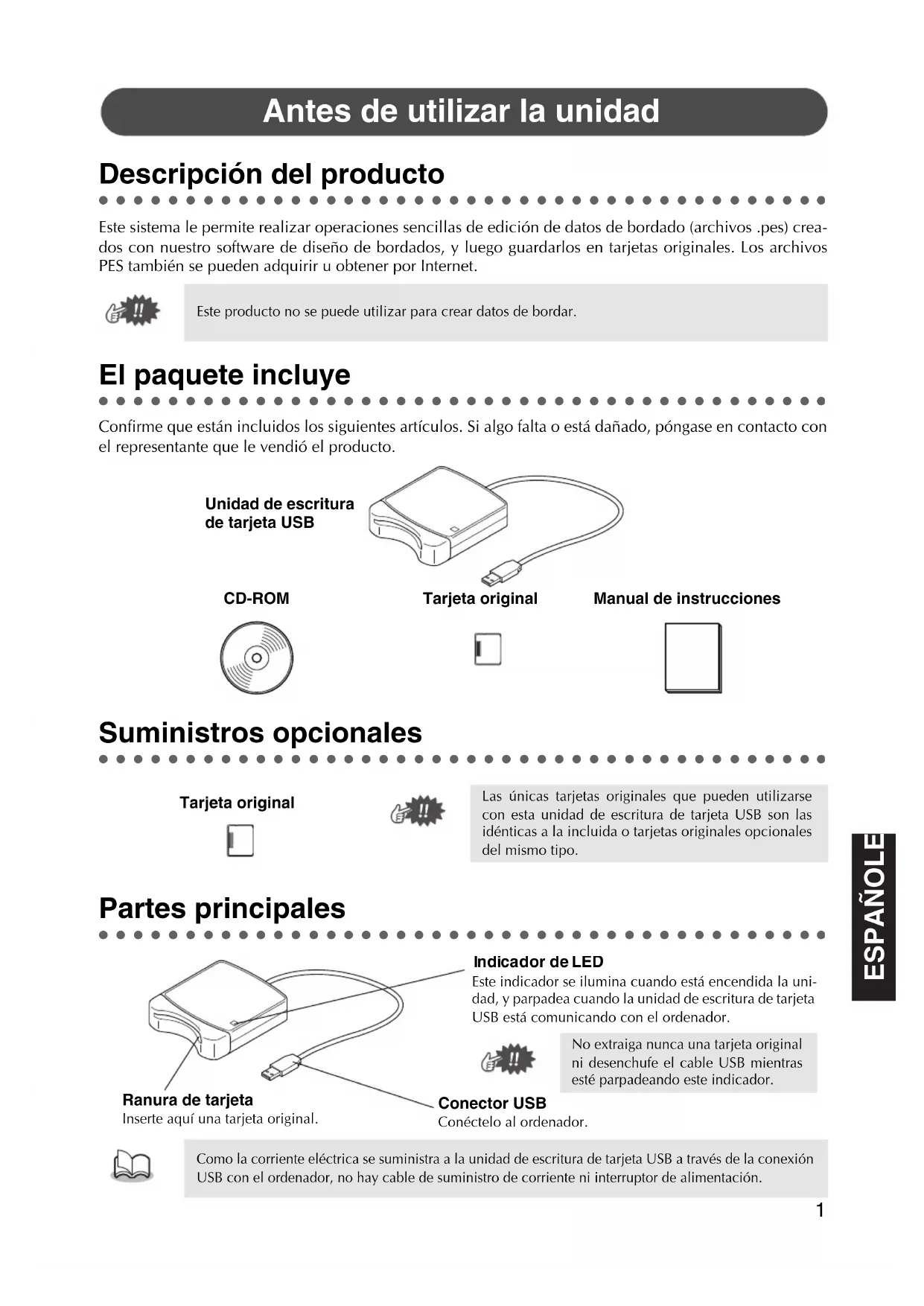 Partes principales Este producto no se puede utilizar para crear datos de bordar. Las únicas tarjetas originales que pueden utilizarsecon esta unidad de escritura de tarjeta USB son lasidénticas a la incluida o tarjetas originales opcionalesdel mismo tipo. Como la corriente eléctrica se suministra a la unidad de escritura de tarjeta USB a través de la conexiónUSB con el ordenador, no hay cable de suministro de corriente ni interruptor de alimentación. Antes de utilizar la unidad
