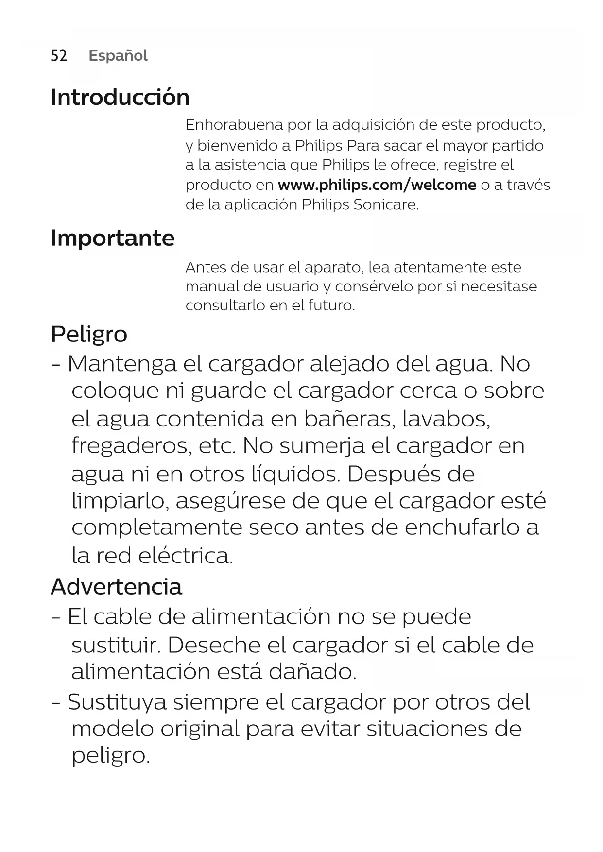DeutschEspañol Introducción Enhorabuena por la adquisición de este producto, y bienvenido a Philips Para sacar el mayor partido a la asistencia que Philips le ofrece, registre el producto en www.philips.com/welcome o a través de la aplicación Philips Sonicare. Importante Antes de usar el aparato, lea atentamente este manual de usuario y consérvelo por si necesitase consultarlo en el futuro. Peligro - Mantenga el cargador alejado del agua. No coloque ni guarde el cargador cerca o sobre el agua contenida en bañeras, lavabos, fregaderos, etc. No sumerja el cargador en agua ni en otros líquidos. Después de limpiarlo, asegúrese de que el cargador esté completamente seco antes de enchufarlo a la red eléctrica. Advertencia - El cable de alimentación no se puede sustituir. Deseche el cargador si el cable de alimentación está dañado. - Sustituya siempre el cargador por otros del modelo original para evitar situaciones de peligro.