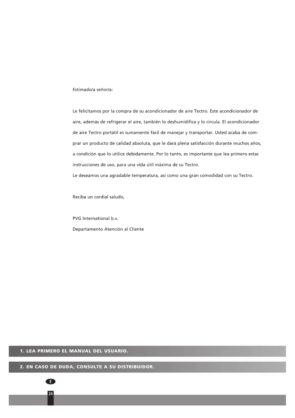 Estimado/a señor/a: Le felicitamos por la compra de su acondicionador de aire Tectro. Este acondicionador de aire, además de refrigerar el aire, también lo deshumidifica y lo circula. El acondicionador de aire Tectro portátil es sumamente fácil de manejar y transportar. Usted acaba de com- prar un producto de calidad absoluta, que le dará plena satisfacción durante muchos años, a condición que lo utilice debidamente. Por lo tanto, es importante que lea primero estas instrucciones de uso, para una vida útil máxima de su Tectro. Le deseamos una agradable temperatura, así como una gran comodidad con su Tectro. Reciba un cordial saludo, PVG International b.v. Departamento Atención al Cliente5