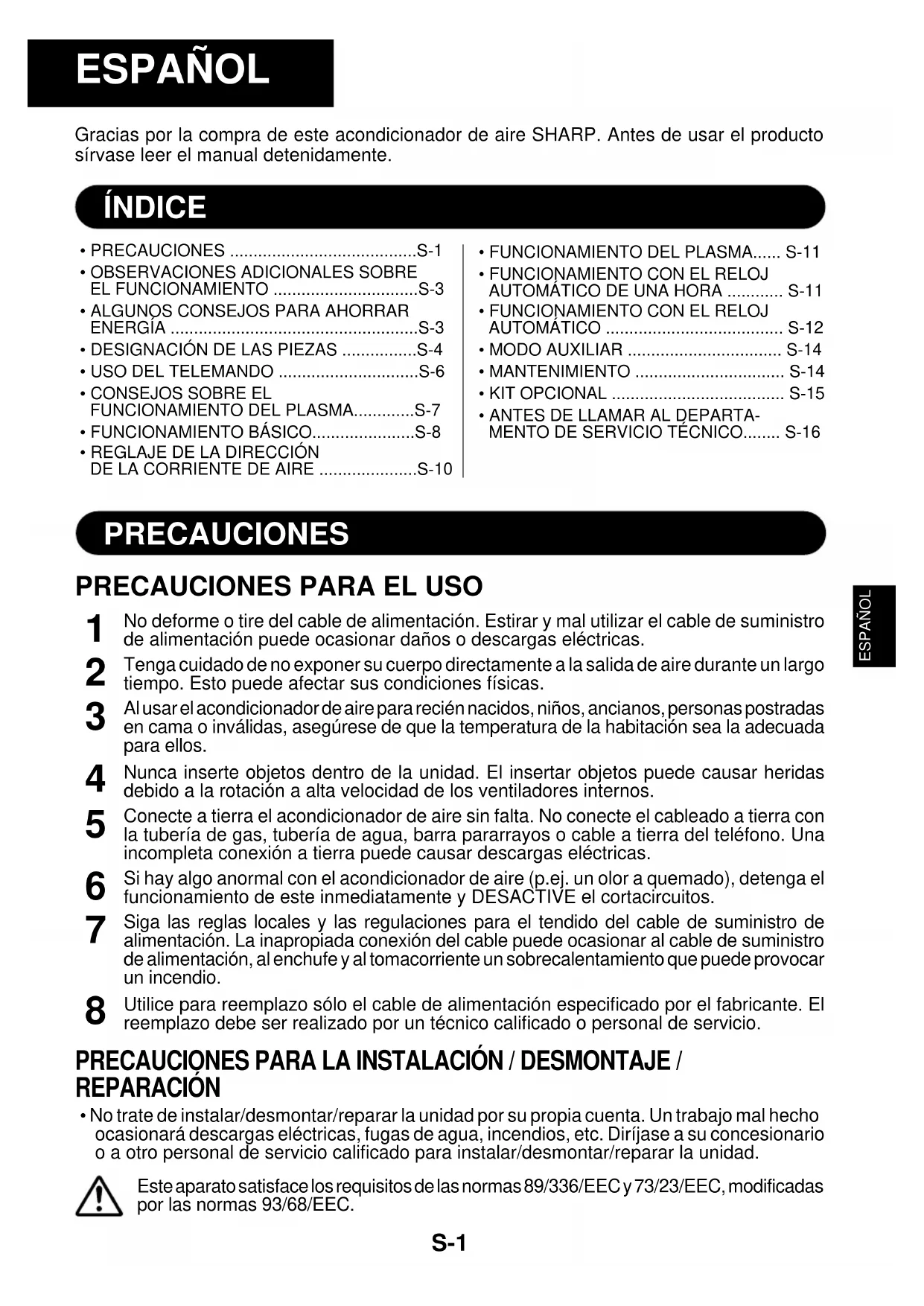 - No trate de instalar/desmontar/reparar la unidad por su propia cuenta. Un trabajo mal hechoocasionará descargas eléctricas, fugas de agua, incendios, etc. Diríjase a su concesionarioo a otro personal de servicio calificado para instalar/desmontar/reparar la unidad.Este aparato satisface los requisitos de las normas 89/336/EEC y 73/23/EEC, modificadaspor las normas 93/68/EEC.PRECAUCIONES