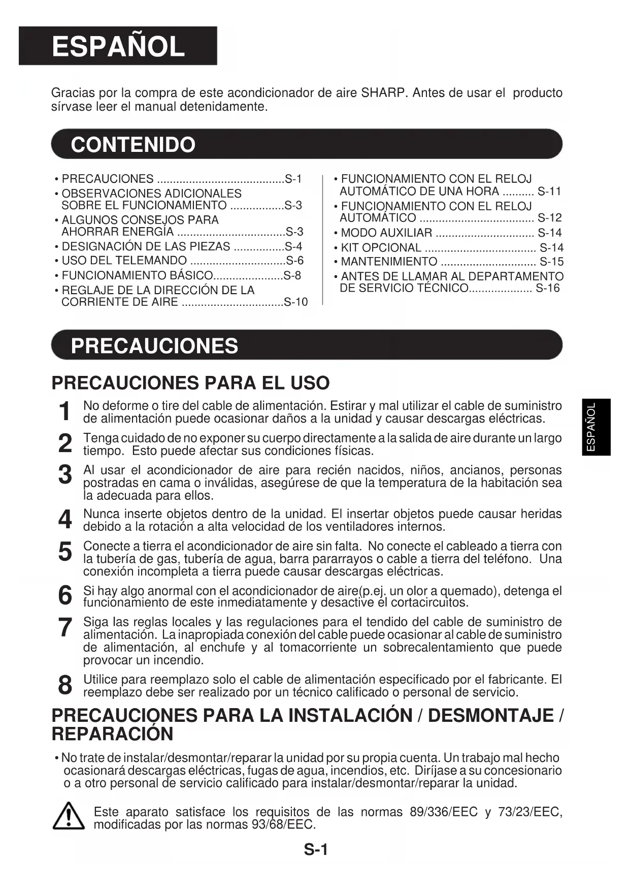 - No trate de instalar/desmontar/reparar la unidad por su propia cuenta. Un trabajo mal hechoocasionará descargas eléctricas, fugas de agua, incendios, etc. Diríjase a su concesionarioo a otro personal de servicio calificado para instalar/desmontar/reparar la unidad.Este aparato satisface los requisitos de las normas 89/336/EEC y 73/23/EEC,modificadas por las normas 93/68/EEC. ESPAÑOL PRECAUCIONESPRECAUCIONES