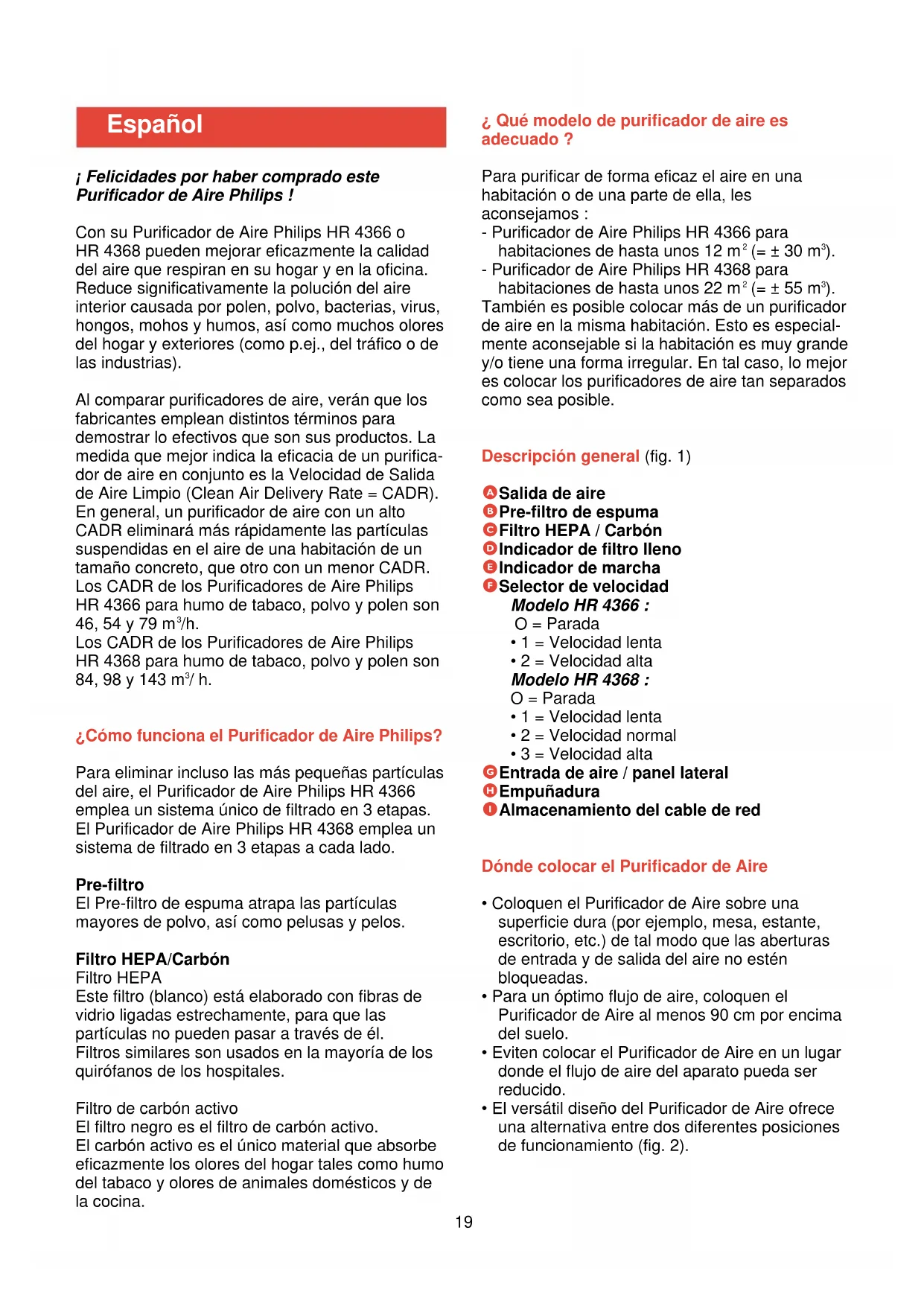 Specifiche / Dati tecnici¡ Felicidades por haber comprado este Purificador de Aire Philips ! Con su Purificador de Aire Philips HR 4366 o HR 4368 pueden mejorar eficazmente la calidad del aire que respiran en su hogar y en la oficina. Reduce significativamente la polución del aire interior causada por polen, polvo, bacterias, virus, hongos, mohos y humos, así como muchos olores del hogar y exteriores (como p.ej., del tráfico o de las industrias). Al comparar purificadores de aire, verán que los fabricantes emplean distintos términos para demostrar lo efectivos que son sus productos. La medida que mejor indica la eficacia de un purifica- dor de aire en conjunto es la Velocidad de Salida de Aire Limpio (Clean Air Delivery Rate = CADR). En general, un purificador de aire con un alto CADR eliminará más rápidamente las partículas suspendidas en el aire de una habitación de un tamaño concreto, que otro con un menor CADR. Los CADR de los Purificadores de Aire Philips HR 4366 para humo de tabaco, polvo y polen son 46, 54 y 79 m