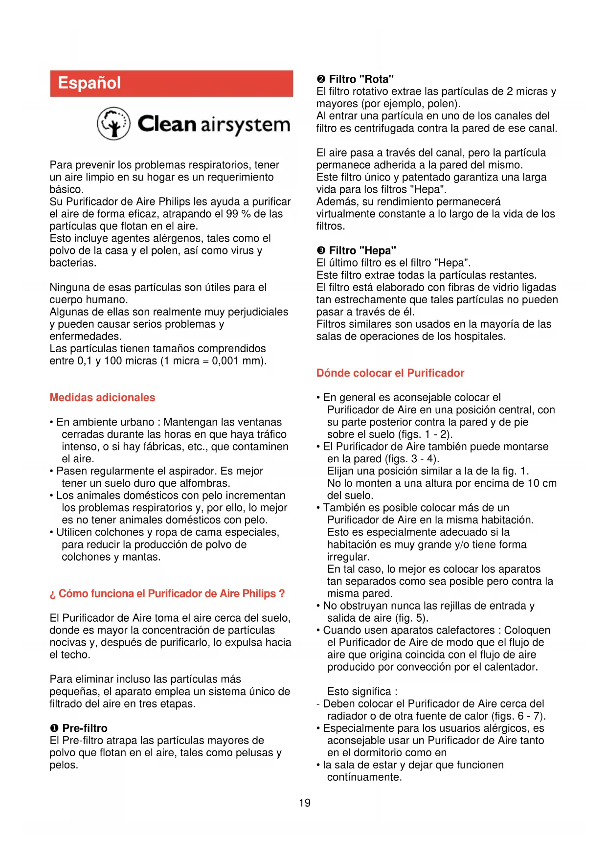 - Las condiciones del aire a filtrar.21 Sustitución de los filtros - Coloquen el selector de la velocidad en la posición O (fig. 9). - Desenchufen el aparato de la red. - Quiten la cubierta frontal (fig. 10). - Quiten los filtros "Hepa" (fig. 11). - Comparen el color de sus lados inferiores con los colores del indicador de "Filtro saturado" (fig. 12). - Sustituyan los filtros "Hepa" tan pronto como el color de sus lados inferiores se corresponda con el gris más oscuro del indicador de "Filtro saturado" (fig. 13). - Quiten el Pre-filtro (fig. 14). - Quiten el filtro "Rota" (fig. 15). Para colocar de nuevo los filtros, procedan en sentido inverso Cierre de seguridad La cubierta frontal tiene un cierre de seguridad que impide abrir la cubierta mientras el Purificador de Aire esté en marcha. El cierre de seguridad también impide la puesta en marcha si la cubierta frontal no está colocada. Limpieza del Pre-filtro y del filtro “Rota”. - Laven (fig. 16) o limpien con un aspirador el Pre-filtro. Pueden quitar las pelusas y pelos, por ejemplo, usando un cepillo suave. - Laven (fig. 17) o limpien con un aspirador el filtro "Rota". Si lo lavan con un detergente, aclaren el filtro con agua limpia caliente (fig. 18). Dejen que los filtros se sequen completamente (fig. 19) al aire antes de volver a montarlos. El filtro "Rota" también puede lavarse en un lavavajillas. Sustitución de los filtros “Hepa” Los nuevos filtros “Hepa” están disponibles en su vendedor bajo el número de tipo HR 4920. Dispositivo automático de seguridad contra sobrecalentamientos Para prevenir el deterioro y reducir los riesgos de seguridad, el dispositivo de seguridad contra sobrecalentamientos desconecta el motor del ventilador si se calienta demasiado. Para indicar que el aparato todavía está en la posición de marcha y conectado a la red, la lámpara piloto permanecerá encendida. Si ello sucede : - Ajusten el selector de velocidad a la posición O (= Paro). - Desenchufen el aparato de la red (la lámpara piloto se apagará). - Esperen a que el motor se enfríe durante unos 15 minutos. - Abran el aparato. Comprueben que los filtros no estén bloqueados y que nada esté obstruyendo el flujo de aire. - Comprueben que el filtro "Rota" pueda girar libremente si lo mueven con la mano (fig. 20). - Cierren el aparato. Enchúfenlo de nuevo a la red y pónganlo en marcha. Si el dispositivo automático contra sobrecalentamientos se activa repetidamente, es aconsejable llevar el aparato a su distribuidor para una inspección técnica.Para evitar problemas respiratórios, torna-se fundamental que o ar respirado nas nossas casas seja limpo. O seu Purificador de Ambiente Philips ajuda a limpar o ar de forma eficaz, retendo até 99% das partículas geradas pelo fumo. Nessas partículas incluem-se os alergénicos como o pó e o pólen, bem como vírus e bactérias. Nenhuma destas partículas é de utilidade para o corpo humano. Algumas delas são, pelo contrário, bastante prejudiciais e poderão provocar sérios distúrbios e doenças. As partículas variam de tamanho, desde 0.1 a 100 micron (1 micron = 0.001 mm). Medidas adicionais