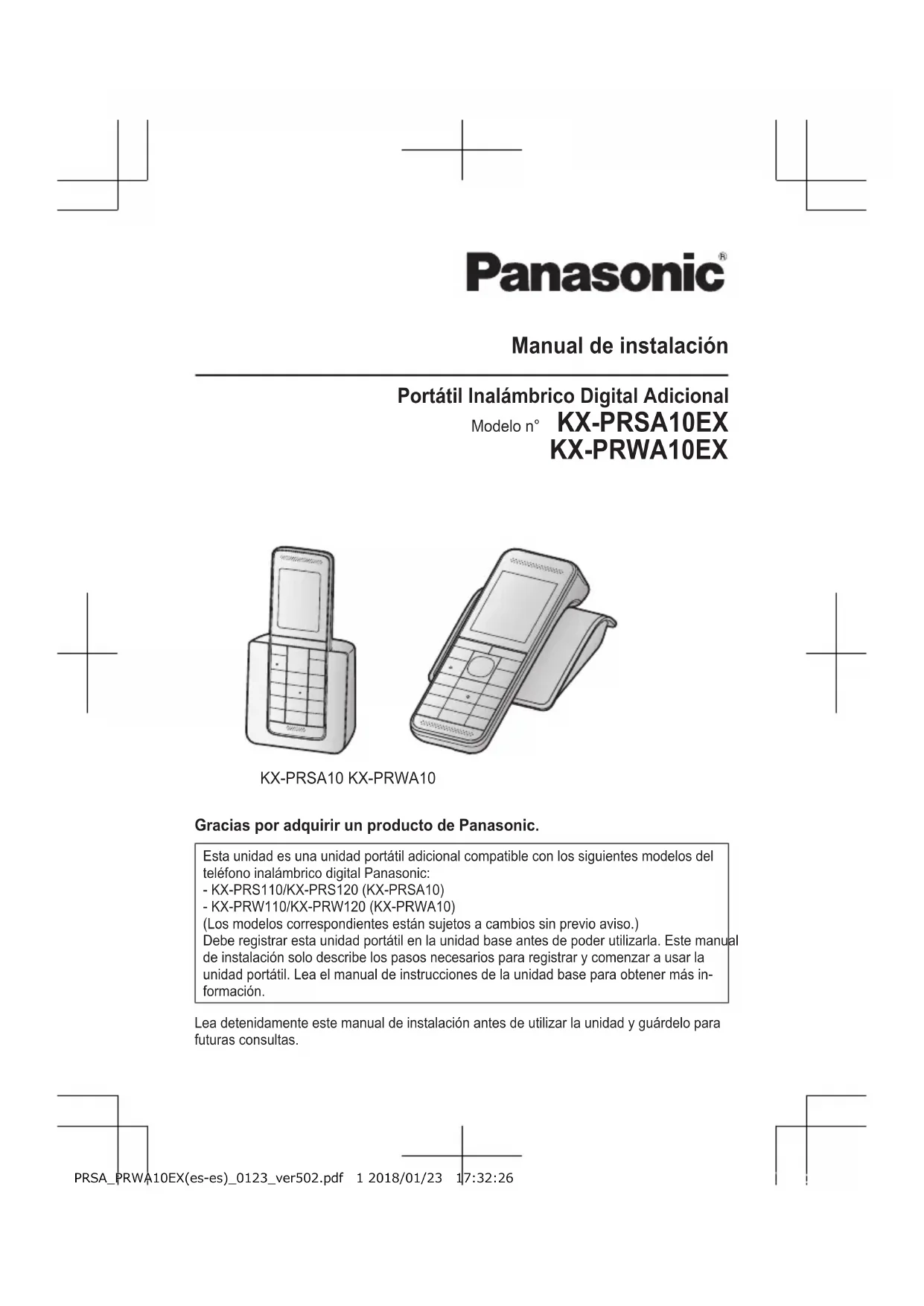 Isætning PRSA_PRWA10EX(da-da)_0123_ver502.pdf 8 2018/01/23 17:05:02Manual de instalación Portátil Inalámbrico Digital Adicional Modelo n° KX-PRSA10EX KX-PRWA10EX KX-PRSA10 KX-PRWA10 Gracias por adquirir un producto de Panasonic. Esta unidad es una unidad portátil adicional compatible con los siguientes modelos del teléfono inalámbrico digital Panasonic: - KX-PRS110/KX-PRS120 (KX-PRSA10) - KX-PRW110/KX-PRW120 (KX-PRWA10) (Los modelos correspondientes están sujetos a cambios sin previo aviso.) Debe registrar esta unidad portátil en la unidad base antes de poder utilizarla. Este manual de instalación solo describe los pasos necesarios para registrar y comenzar a usar la unidad portátil. Lea el manual de instrucciones de la unidad base para obtener más in- formación. Lea detenidamente este manual de instalación antes de utilizar la unidad y guárdelo para futuras consultas. PRSA_PRWA10EX(es-es)_0123_ver502.pdf 1 2018/01/23 17:32:26Información sobre accesorios Accesorios incluidos Accesorio/número de pieza Cantidad Cargador 1 Adaptador de CA/PNLV233CE 1 Pilas recargables