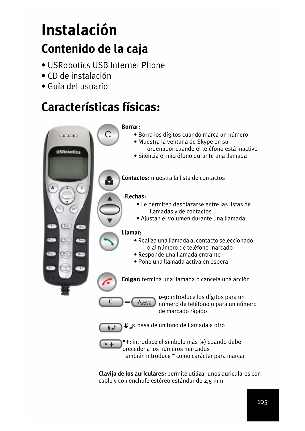 Flechas: • Le permiten desplazarse entre las listas de llamadas y de contactos• Ajustan el volumen durante una llamada #106 Requisitos del sistema Para utilizar el USRobotics USB Internet Phone y el servicio de telefonía por Internet de Skype™, el equipo informático y el sistema operativo deben cumplir los siguientes requisitos mínimos: