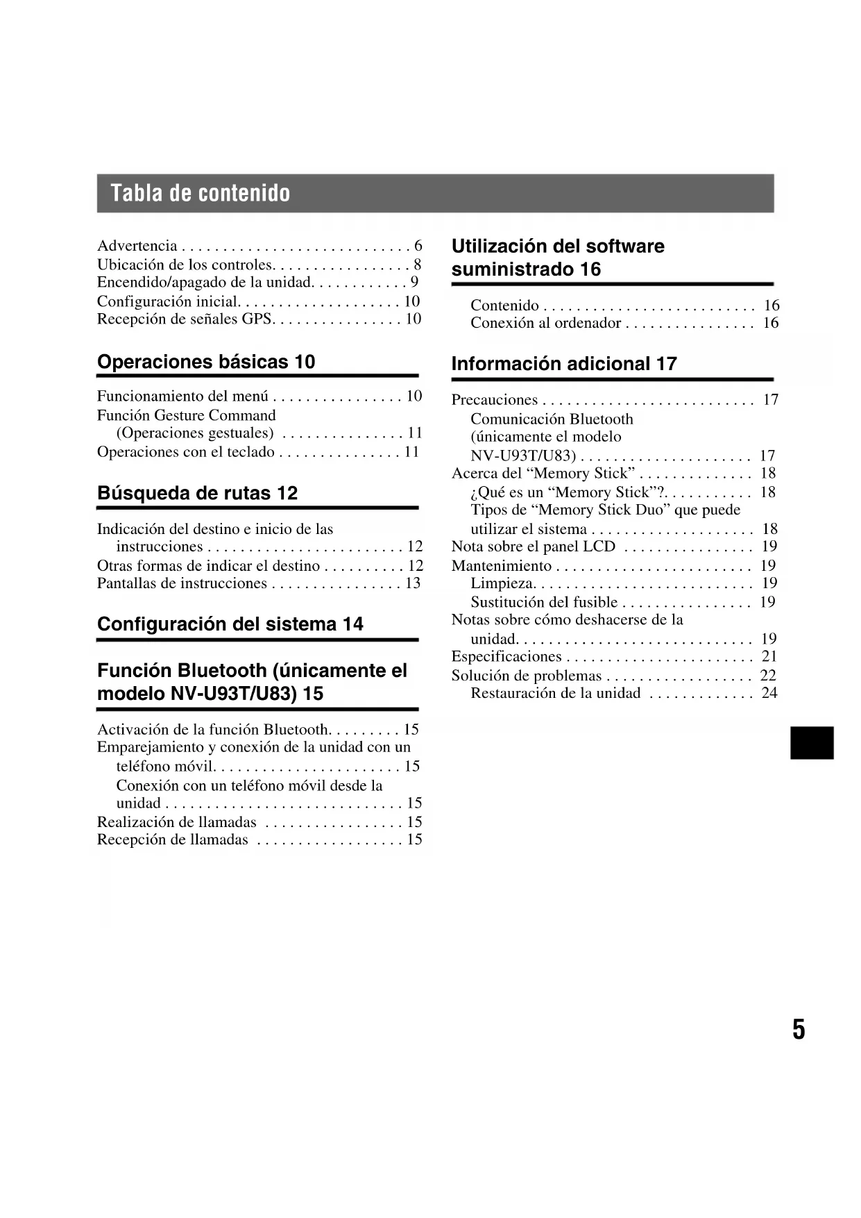 - SOFTWARE DE ÉSTE. Por medio de la presente, Sony Corp. declara que los modelos NV-U93T/U83 cumplen con los requisitos esenciales y cualesquiera otras disposiciones aplicables o exigibles de la Directiva 1999/5/CE. Para mayor información, por favor consulte el siguiente URL: http://www.compliance.sony.de/ No está permitido el uso de este equipo de radio en la zona geográfica incluida en un radio de 20 km desde el centro de Ny-Alesund, Svalbard en Noruega. El fabricante de este producto es Sony Corporation, 1-7-1 Konan, Minato-ku, Tokio, 108-0075 Japón. El representante autorizado para la aplicación de la directiva EMC y la seguridad de los productos es Sony Deutschland GmbH, Hedelfinger Strasse 61, 70327 Stuttgart, Alemania. Para cualquier cuestión relacionada con el servicio técnico o la garantía, consulte las direcciones facilitadas en los documentos de garantía o servicio técnico.45 Tabla de contenido Advertencia p. 6