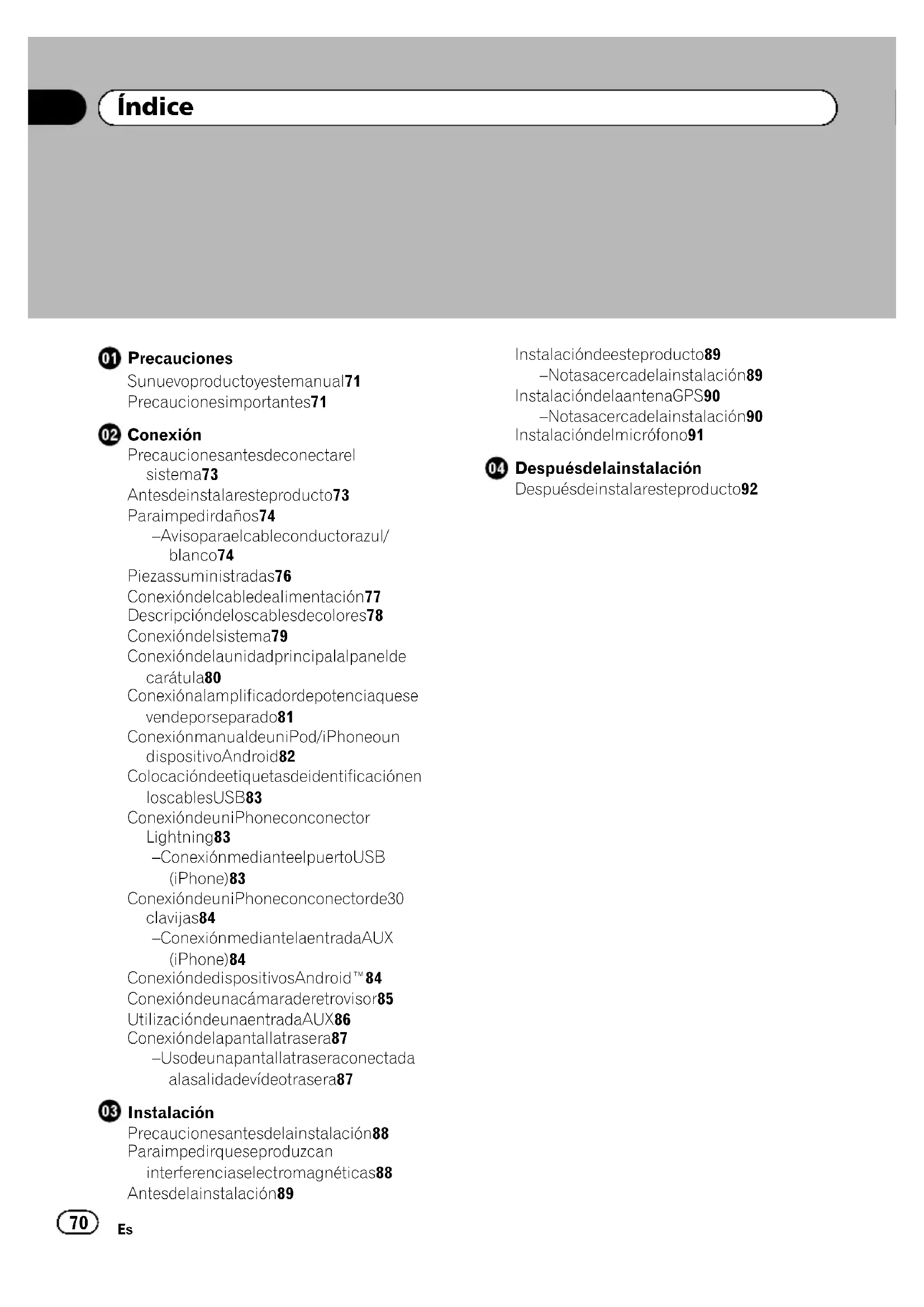 Dopo l’installazioneBlack plate (70,1) Precauciones Su nuevo producto y este manual 71 Precauciones importantes 71 Conexión Precauciones antes de conectar el sistema 73 Antes de instalar este producto 73 Para impedir daños 74 – Aviso para el cable conductor azul/ blanco 74 Piezas suministradas 76 Conexión del cable de alimentación 77 Descripción de los cables de colores 78 Conexión del sistema 79 Conexión de la unidad principal al panel de carátula 80 Conexión al amplificador de potencia que se vende por separado 81 Conexión manual de un iPod / iPhone o un dispositivo Android 82 Colocación de etiquetas de identificación en los cables USB 83 Conexión de un iPhone con conector Lightning 83 – Conexión mediante el puerto USB (iPhone) 83 Conexión de un iPhone con conector de 30 clavijas 84 – Conexión mediante la entrada AUX (iPhone) 84 Conexión de dispositivos Android™ 84 Conexión de una cámara de retrovisor 85 Utilización de una entrada AUX 86 Conexión de la pantalla trasera 87 – Uso de una pantalla trasera conectada a la salida de vídeo trasera 87 Instalación Precauciones antes de la instalación 88 Para impedir que se produzcan interferencias electromagnéticas 88 Antes de la instalación 89 Instalación de este producto 89 – Notas acerca de la instalación 89 Instalación de la antena GPS 90 – Notas acerca de la instalación 90 Instalación del micrófono 91 Después de la instalación Después de instalar este producto 92 <CRD4965-A>70 Índice
