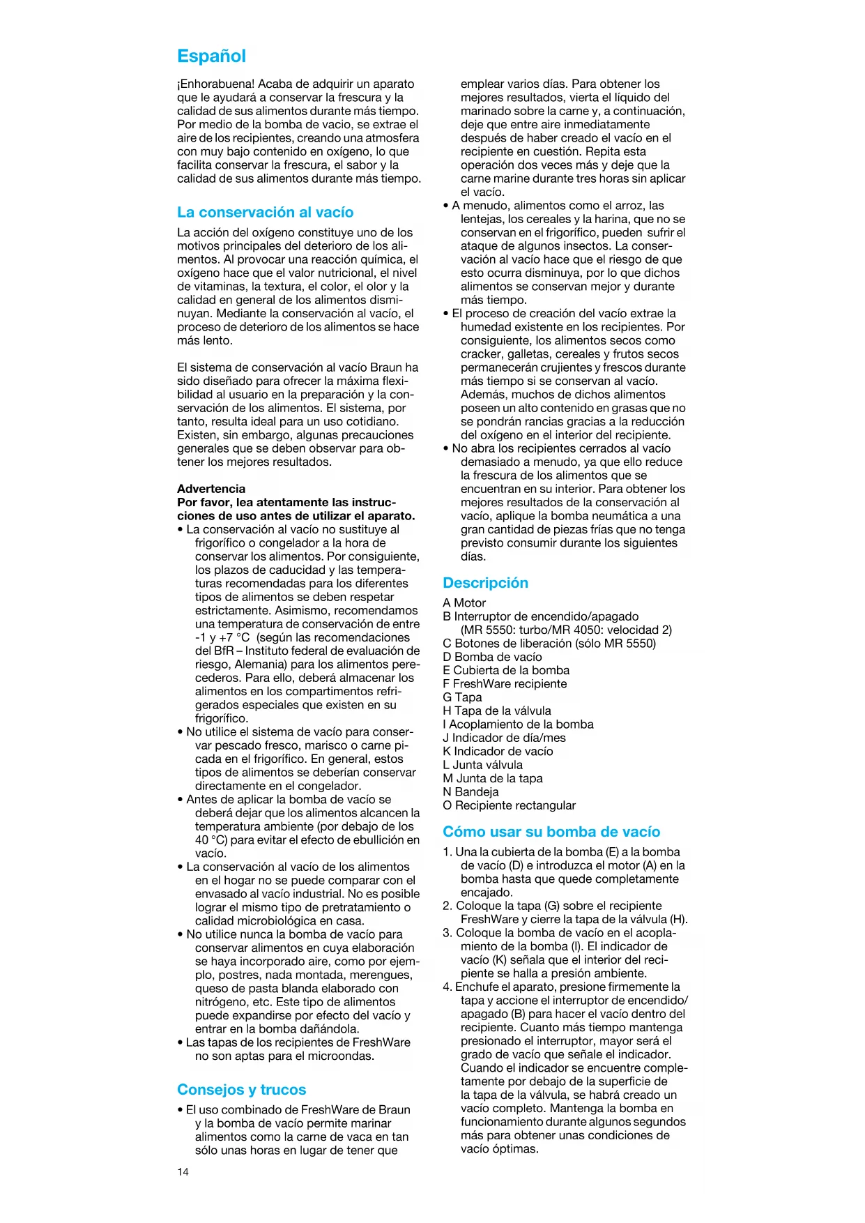 - Gracias al sistema de seguridad del que dispone la cubierta de la bomba, el vacío sólo se aplica cuando la bomba está conectada, en el acoplamiento de la bomba. Beneficios del sistema de con- servación de los alimentos Braun (homologados por el Instituto Fraunhofer, Alemania) Datos para la conservación en el frigorífico: entre -1 y +7 °C