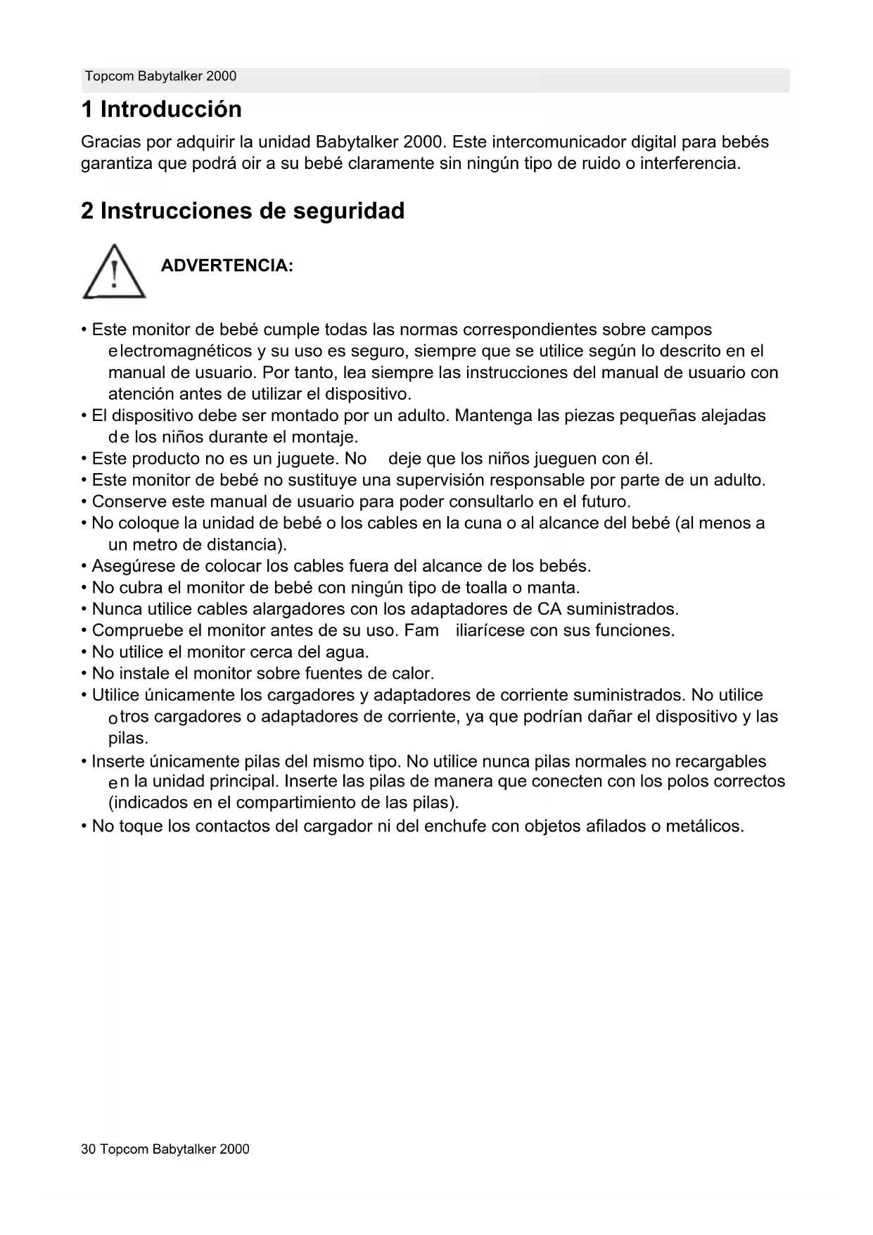 nidad de bebé.32 Topcom Babytalker 2000 Topcom Babytalker 2000 No mezcle pilas viejas con otras nuevas. Mantenga las pilas fuera del alcance de los niños. No provoque cortocircuitos ni tire las pilas al fuego. Retírelas si no va a utilizar el di spositivo durante mucho tiempo.