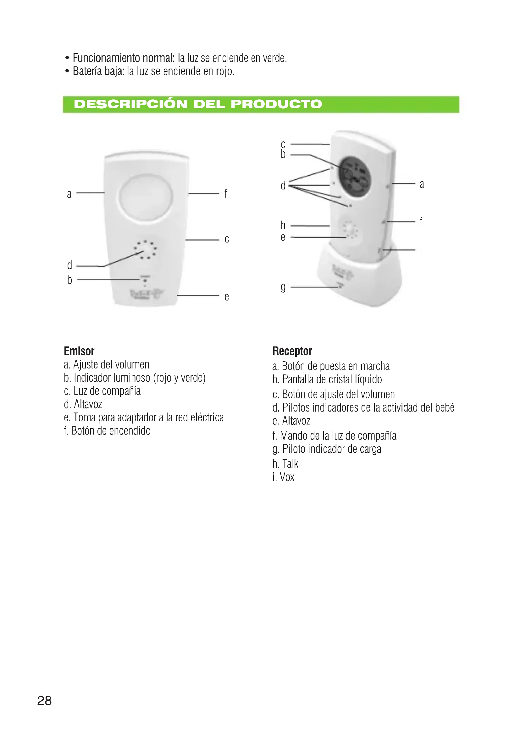 Emisor a. Ajuste del volumen b. Indicador luminoso (rojo y verde) c. Luz de compañía d. Altavoz e. Toma para adaptador a la red eléctrica f. Botón de encendido Receptor a. Botón de puesta en marcha b. Pantalla de cristal líquido c. Botón de ajuste del volumen d. Pilotos indicadores de la actividad del bebé e. Altavoz f. Mando de la luz de compañía g. Piloto indicador de carga h. Talk