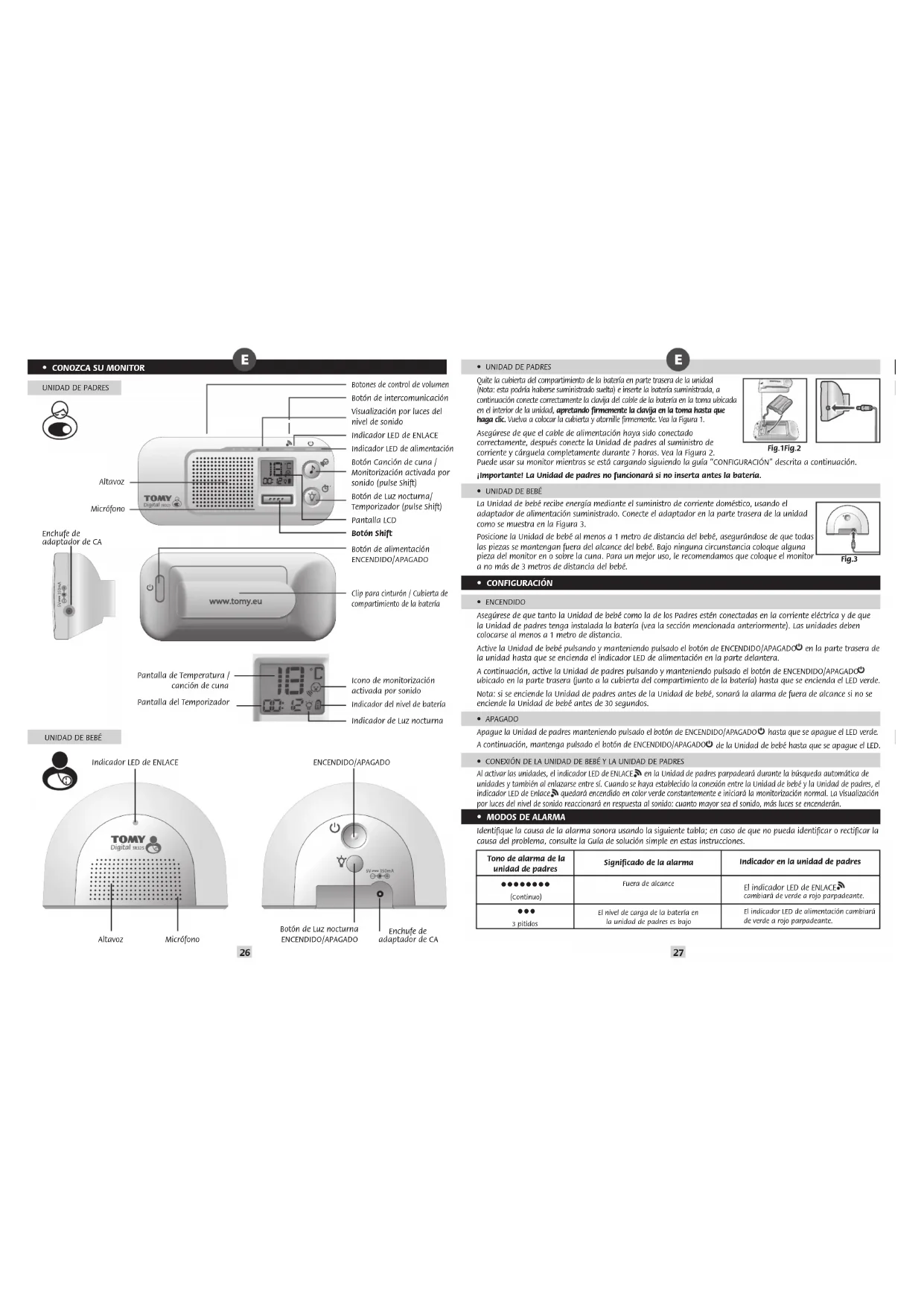 - INFORMACIÓN DE SEGURIDAD ¡IMPORTANTE! ¡Este monitor es solo para uso en interiores! El Monitor para Bebés de Tomy está diseñado para ayudarle a vigilar a su niño y no sustituye la supervision de un adulto. Este producto no es un juguete. Mantenga siempre los artículos eléctricos y sus cables fuera del alcance de los bebés y niños pequeños. Bajo ninguna circunstancia debe colocar ninguna pieza de su monitor en o sobre la cuna. Asegúrese de que todos los cables estén colocados correctamente, de forma que los niños no se enreden en ellos y no haya peligro de tropiezos. Los adaptadores que vienen con el monitor no deben ser usados con ningún otro equipo bajo ninguna circunstancia. No debe utilizarse ningún otro adaptador con el monitor. Tenga cuidado de no colocar el adaptador en un lugar donde el niño pueda subirse a él. Poner peso sobre el adaptador mientras está conectado puede dañar la unidad o causar lesiones al niño. Es normal que los cargadores se calienten al usarse - tenga cuidado al manipular su cargador, espere a que se enfríe. NO LO CUBRA. Desconecte el cargador si el producto no va a usarse durante algunos días. Para evitar riesgo de descarga eléctrica, desconéctelo de la electricidad antes de limpiarlo. La batería recargable dentro de la Unidad de Padres debe reciclarse. No tirar junto con los residuos domésticos. No intente desmontar ninguna pieza de este producto.