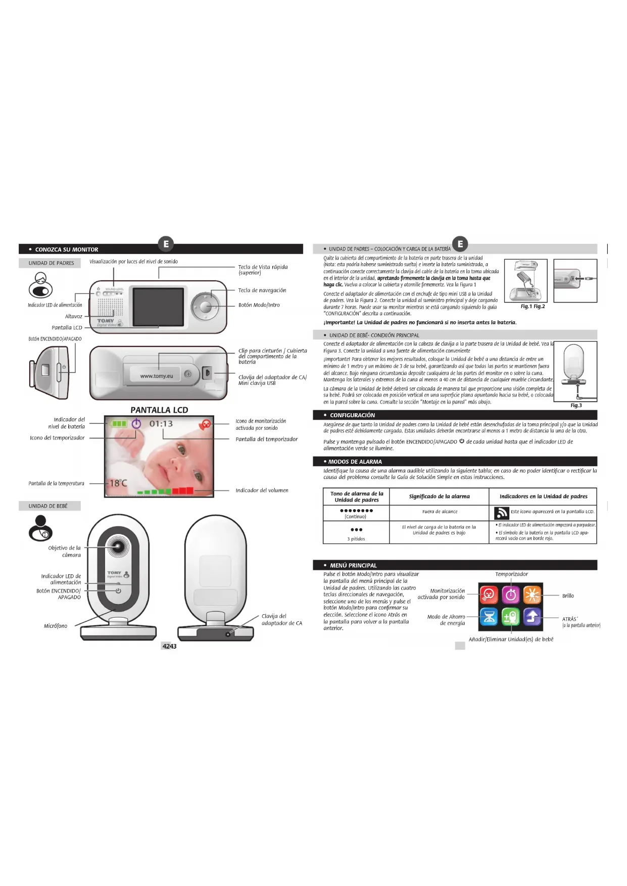 - INFORMACIÓN DE SEGURIDAD ¡IMPORTANTE! ¡Este monitor es solo para uso en interiores! El Monitor para Bebés de Tomy está diseñado para ayudarle a vigilar a su niño y no sustituye la supervision de un adulto. Este producto no es un juguete. Mantenga siempre los artículos eléctricos y sus cables fuera del alcance de los bebés y niños pequeños. Bajo ninguna circunstancia debe colocar ninguna pieza de su monitor en o sobre la cuna. Asegúrese de que todos los cables estén colocados correctamente, de forma que los niños no se enreden en ellos y no haya peligro de tropiezos. Los adaptadores que vienen con el monitor no deben ser usados con ningún otro equipo bajo ninguna circunstancia. No debe utilizarse ningún otro adaptador con el monitor. Tenga cuidado de no colocar el adaptador en un lugar donde el niño pueda subirse a él. Poner peso sobre el adaptador mientras está conectado puede dañar la unidad o causar lesiones al niño. Es normal que los cargadores se calienten al usarse - tenga cuidado al manipular su cargador, espere a que se enfríe. NO LO CUBRA. Desconecte el cargador si el producto no va a usarse durante algunos días. Para evitar riesgo de descarga eléctrica, desconéctelo de la electricidad antes de limpiarlo. La batería recargable dentro de la Unidad de Padres debe reciclarse. No tirar junto con los residuos domésticos. No intente desmontar ninguna pieza de este producto.