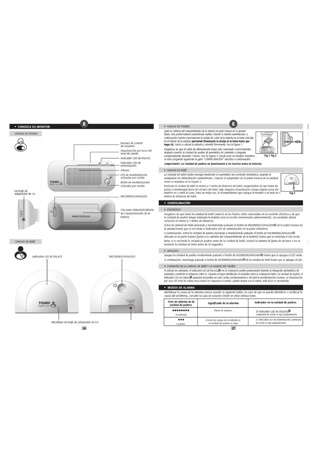 - INFORMACIÓN DE SEGURIDAD ¡IMPORTANTE! ¡Este monitor es solo para uso en interiores! El Monitor para Bebés de Tomy está diseñado para ayudarle a vigilar a su niño y no sustituye la supervision de un adulto. Este producto no es un juguete. Mantenga siempre los artículos eléctricos y sus cables fuera del alcance de los bebés y niños pequeños. Bajo ninguna circunstancia debe colocar ninguna pieza de su monitor en o sobre la cuna. Asegúrese de que todos los cables estén colocados correctamente, de forma que los niños no se enreden en ellos y no haya peligro de tropiezos. Los adaptadores que vienen con el monitor no deben ser usados con ningún otro equipo bajo ninguna circunstancia. No debe utilizarse ningún otro adaptador con el monitor. Tenga cuidado de no colocar el adaptador en un lugar donde el niño pueda subirse a él. Poner peso sobre el adaptador mientras está conectado puede dañar la unidad o causar lesiones al niño. Es normal que los cargadores se calienten al usarse - tenga cuidado al manipular su cargador, espere a que se enfríe. NO LO CUBRA. Desconecte el cargador si el producto no va a usarse durante algunos días. Para evitar riesgo de descarga eléctrica, desconéctelo de la electricidad antes de limpiarlo. La batería recargable dentro de la Unidad de Padres debe reciclarse. No tirar junto con los residuos domésticos. No intente desmontar ninguna pieza de este producto.