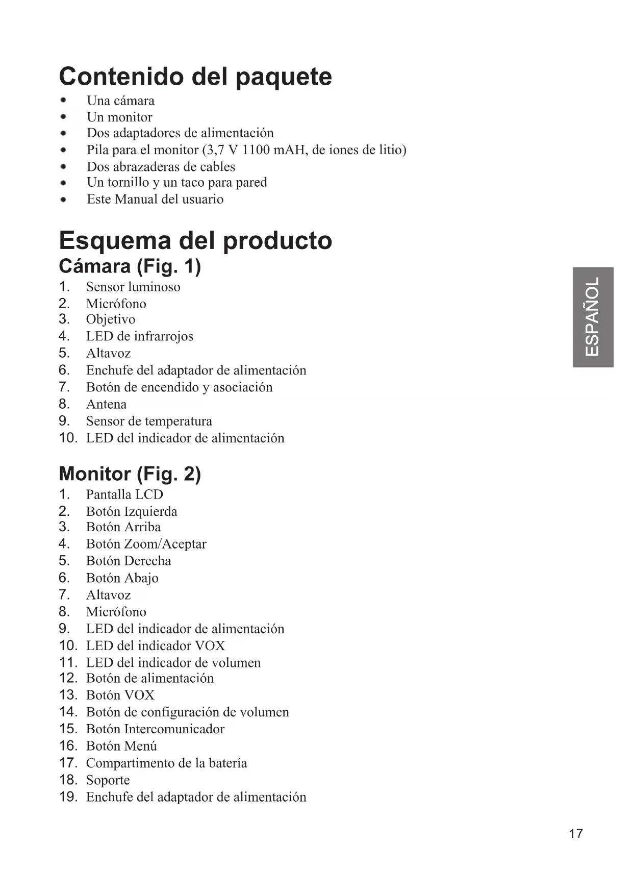 cable del adaptador 1 metro (3 pies) unidad del bebé 1 metro (3 pies)- Utilice un monitor para bebés inalámbrico para evitar el riesgo de estrangulamiento.