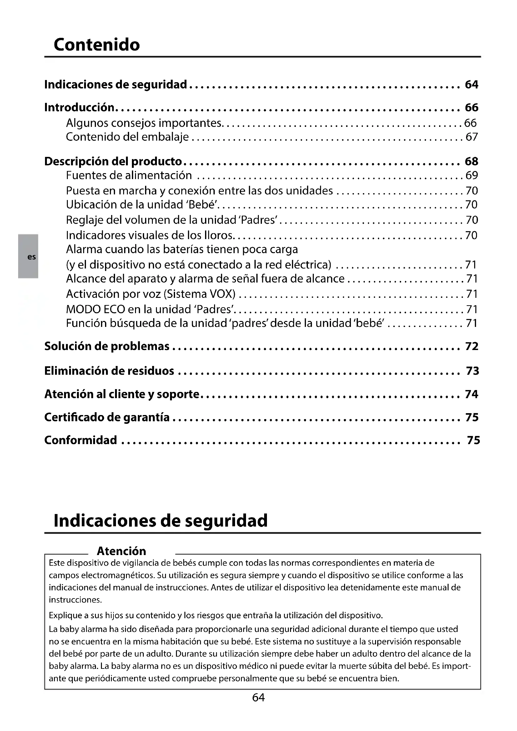 - De bovenstaande regelingen houden geen wijziging van de bewijslastregels ten nadele van de klant in. Neem in geval van een garantieclaim contact op met Gigaset Communications. Goedkeuring Dit toestel is geschikt voor wereldwijd gebruik; buiten de Europese Economische Ruimte (met uitzondering van Zwitserland) afhankelijk van nationale goedkeuring van het betreende land. Het toestel is compatibel met landspecieke bijzonderheden. Hiermee verklaart Gigaset Communications GmbH dat dit toestel voldoet aan de basiseisen en andere relevante bepalingen van Richtlijn 1999/5/EC. Een kopie van de Conformiteitsverklaring vindt u op internet onder www.gigaset.com/docs nl64 Contenido Indicaciones de seguridad ................................................ 64 Introducción............................................................. 66 Algunos consejos importantes...............................................66 Contenido del embalaje . . . . . . . . . . . . . . . . . . . . . . . . . . . . . . . . . . . . . . . . . . . . . . . . . . . . . 67 Descripción del producto................................................. 68 Fuentes de alimentación ....................................................69 Puesta en marcha y conexión entre las dos unidades .........................70 Ubicación de la unidad ‘Bebé’................................................70 Reglaje del volumen de la unidad ‘Padres’ ....................................70 Indicadores visuales de los lloros.............................................70 Alarma cuando las baterías tienen poca carga (y el dispositivo no está conectado a la red eléctrica) .........................71 Alcance del aparato y alarma de señal fuera de alcance .......................71 Activación por voz (Sistema VOX) ............................................71 MODO ECO en la unidad ‘Padres’.............................................71 Función búsqueda de la unidad ‘padres’ desde la unidad ‘bebé’ ...............71 Solución de problemas . . . . . . . . . . . . . . . . . . . . . . . . . . . . . . . . . . . . . . . . . . . . . . . . . . . 72 Eliminación de residuos .................................................. 73 Atención al cliente y soporte.............................................. 74 Certicado de garantía ................................................... 75 Conformidad ............................................................ 75 Indicaciones de seguridad Este dispositivo de vigilancia de bebés cumple con todas las normas correspondientes en materia de campos electromagnéticos. Su utilización es segura siempre y cuando el dispositivo se utilice conforme a las indicaciones del manual de instrucciones. Antes de utilizar el dispositivo lea detenidamente este manual de instrucciones. Explique a sus hijos su contenido y los riesgos que entraña la utilización del dispositivo. La baby alarma ha sido diseñada para proporcionarle una seguridad adicional durante el tiempo que usted no se encuentra en la misma habitación que su bebé. Este sistema no sustituye a la supervisión responsable del bebé por parte de un adulto. Durante su utilización siempre debe haber un adulto dentro del alcance de la baby alarma. La baby alarma no es un dispositivo médico ni puede evitar la muerte súbita del bebé. Es import- ante que periódicamente usted compruebe personalmente que su bebé se encuentra bien. Atención es65 Indicaciones de seguridad Recuerde que la unidad del bebé y el cable deben encontrarse siempre fuera del alcance de los niños (una separación mínima de 1 metro). No debe dejar la unidad del bebé dentro de la cuna o del parque bajo ninguna circunstancia. Utilice únicamente el transformador de red proporcionado con el producto. No utilice ningún otro transformador ya que podría dañar el aparato, las baterías o las pilas. Asegúrese de que la tensión del dispositivo se corresponde con la de la red eléctrica. Si el transformador de alimentación estuviera dañado, este solo puede sustituirse por un recambio original. No utilice pilas alcalinas recargables en la unidad de los padres. Utilice solo las baterías indicadas en las especicaciones (véase “Datos técnicos”). Las pilas y las baterías pueden explotar si se exponen a la radiación directa del sol, al fuego o a temperaturas elevadas debidas a otras circunstancias. Unidad de los padres: En la unidad de los padres solo pueden utilizarse baterías recargables con la especicación 2x 550mAh AAA NiMH. De lo contrario pueden producirse daños graves para las personas o la salud. Debe sustituir inmediatamente las baterías que presenten daños visibles. De esta forma evitará que se produzcan daños por derrames de las pilas o las baterías.