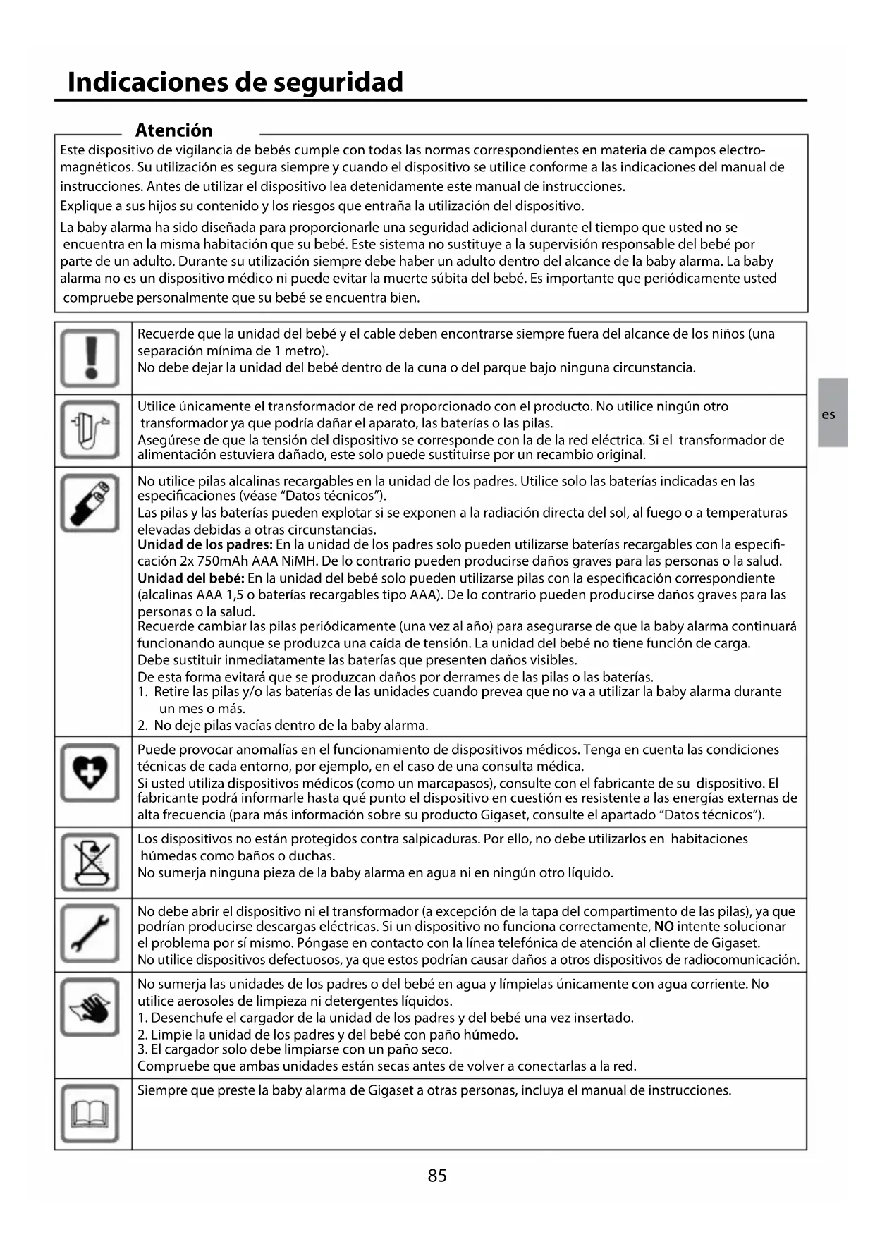 Puede provocar anomalías en el funcionamiento de dispositivos médicos. Tenga en cuenta las condiciones técnicas de cada entorno, por ejemplo, en el caso de una consulta médica. Si usted utiliza dispositivos médicos (como un marcapasos), consulte con el fabricante de su dispositivo. El fabricante podrá informarle hasta qué punto el dispositivo en cuestión es resistente a las energías externas de alta frecuencia (para más información sobre su producto Gigaset, consulte el apartado “Datos técnicos”). Los dispositivos no están protegidos contra salpicaduras. Por ello, no debe utilizarlos en habitaciones húmedas como baños o duchas. No sumerja ninguna pieza de la baby alarma en agua ni en ningún otro líquido. No debe abrir el dispositivo ni el transformador (a excepción de la tapa del compartimento de las pilas), ya que podrían producirse descargas eléctricas. Si un dispositivo no funciona correctamente, NO intente solucionar el problema por sí mismo. Póngase en contacto con la línea telefónica de atención al cliente de Gigaset. No utilice dispositivos defectuosos, ya que estos podrían causar daños a otros dispositivos de radiocomunicación. No sumerja las unidades de los padres o del bebé en agua y límpielas únicamente con agua corriente. No utilice aerosoles de limpieza ni detergentes líquidos.