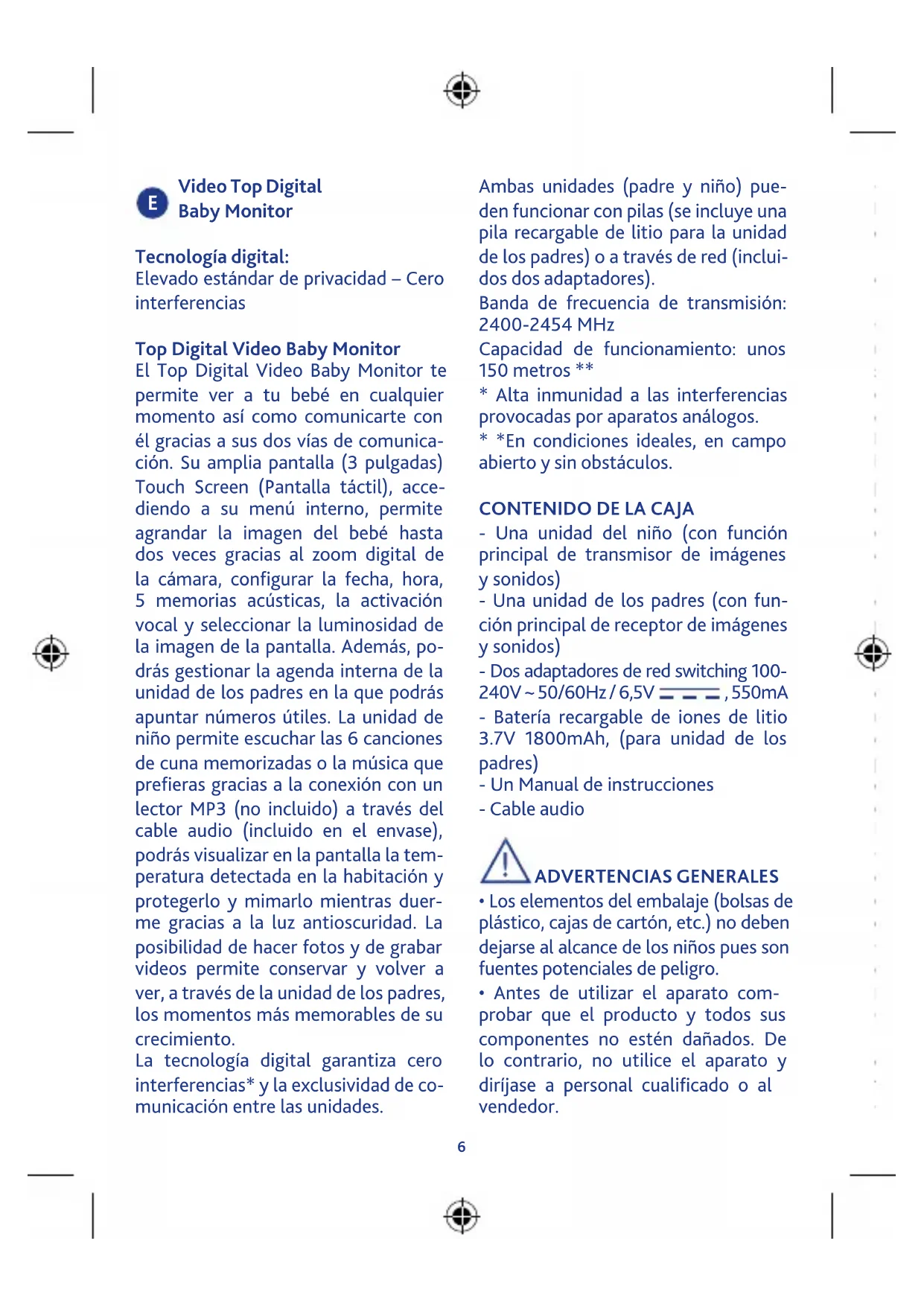 - Una unidad del niño (con función principal de transmisor de imágenes y sonidos) - Una unidad de los padres (con fun- ción principal de receptor de imágenes y sonidos) - Dos adaptadores de red switching 100- 240V ~ 50/60Hz / 6,5V , 550mA - Batería recargable de iones de litio 3.7V 1800mAh, (para unidad de los padres) - Un Manual de instrucciones - Cable audio ADVERTENCIAS GENERALES