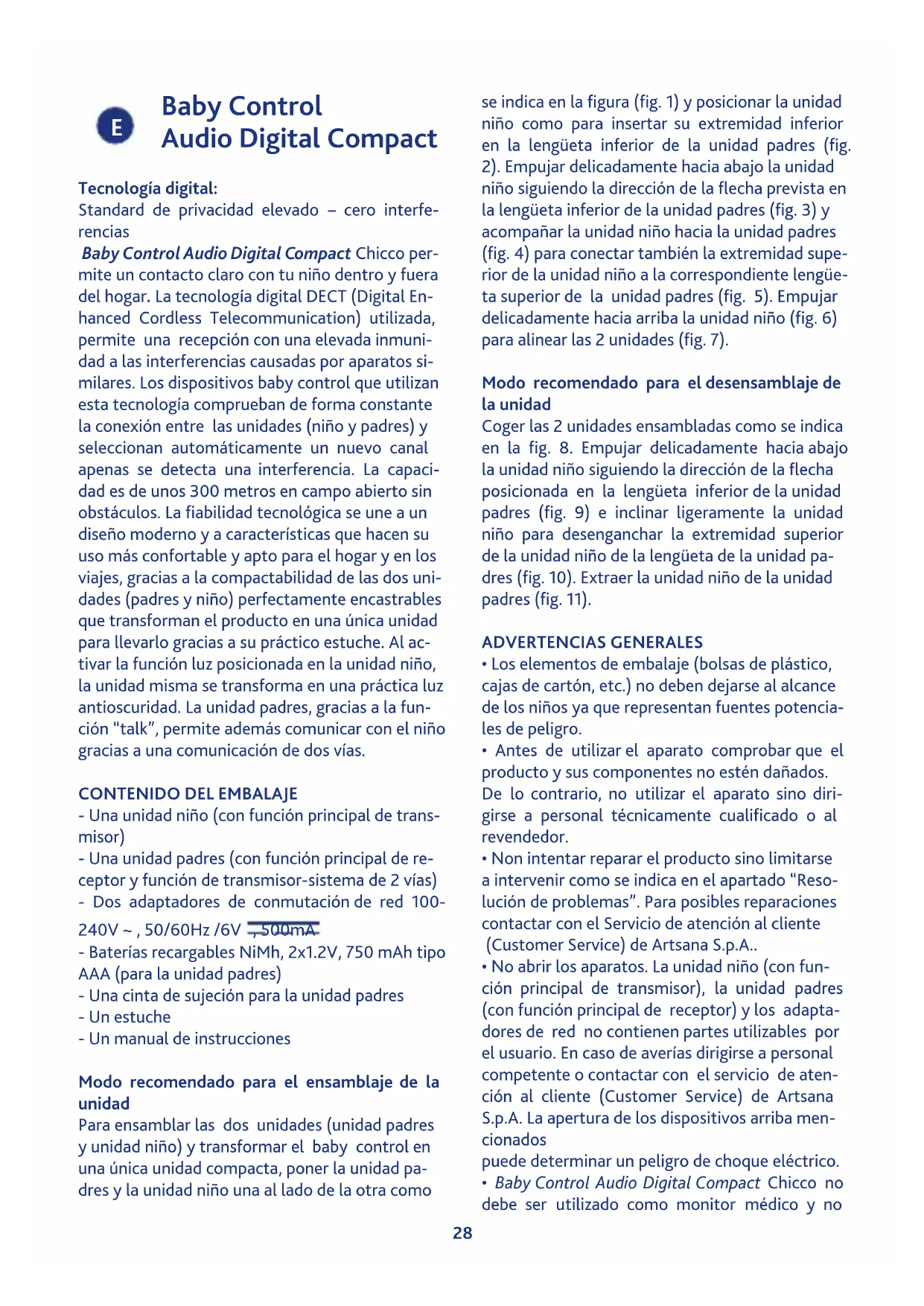 - Una unidad niño (con función principal de trans- misor) - Una unidad padres (con función principal de re- ceptor y función de transmisor-sistema de 2 vías) - Dos adaptadores de conmutación de red 100- 240V ~ , 50/60Hz /6V , 500mA - Baterías recargables NiMh, 2x1.2V, 750 mAh tipo AAA (para la unidad padres) - Una cinta de sujeción para la unidad padres - Un estuche - Un manual de instrucciones Modo recomendado para el ensamblaje de la unidad Para ensamblar las dos unidades (unidad padres y unidad niño) y transformar el baby control en una única unidad compacta, poner la unidad pa- dres y la unidad niño una al lado de la otra como se indica en la figura (fig. 1) y posicionar la unidad niño como para insertar su extremidad inferior en la lengüeta inferior de la unidad padres (fig. 2). Empujar delicadamente hacia abajo la unidad niño siguiendo la dirección de la flecha prevista en la lengüeta inferior de la unidad padres (fig. 3) y acompañar la unidad niño hacia la unidad padres (fig. 4) para conectar también la extremidad supe- rior de la unidad niño a la correspondiente lengüe- ta superior de la unidad padres (fig. 5). Empujar delicadamente hacia arriba la unidad niño (fig. 6) para alinear las 2 unidades (fig. 7). Modo recomendado para el desensamblaje de la unidad Coger las 2 unidades ensambladas como se indica en la fig. 8. Empujar delicadamente hacia abajo la unidad niño siguiendo la dirección de la flecha posicionada en la lengüeta inferior de la unidad padres (fig. 9) e inclinar ligeramente la unidad niño para desenganchar la extremidad superior de la unidad niño de la lengüeta de la unidad pa- dres (fig. 10). Extraer la unidad niño de la unidad padres (fig. 11). ADVERTENCIAS GENERALES