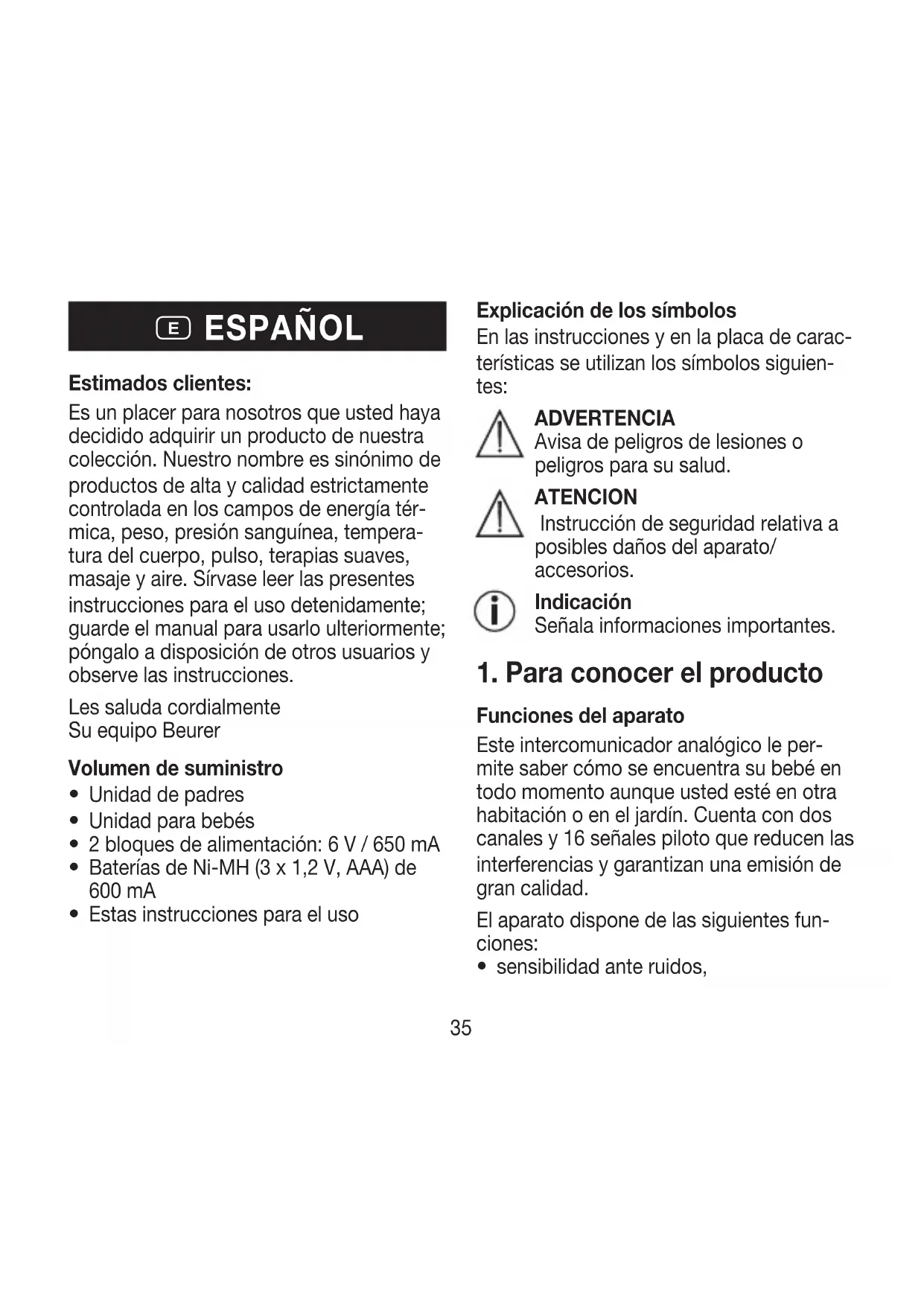 ESPAÑOL Explicación de los símbolos En las instrucciones y en la placa de carac- terísticas se utilizan los símbolos siguien- tes: ADVERTENCIA Avisa de peligros de lesiones o peligros para su salud. ATENCION Instrucción de seguridad relativa a posibles daños del aparato/ accesorios. Indicación Señala informaciones importantes.