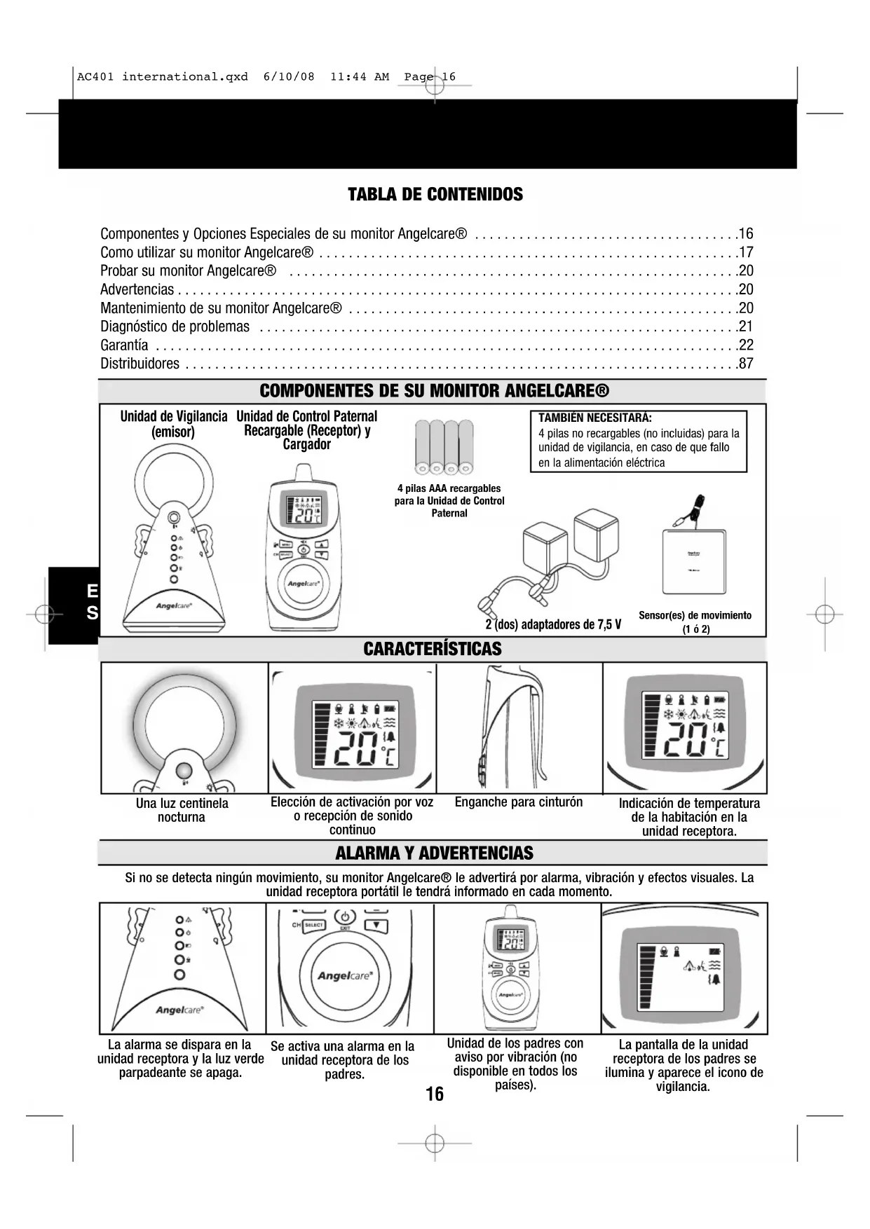 Angelcare® garantiza al propietario inicial de este producto que durante un periodo de un (1) año a partir de la fecha de compra original, el intercomunicador Angelcare® no comportará ningún fallo de material ni de fabricación. Si este sistema de monitorización deja de funcionar correctamente dentro del primer año y utilizándose en condiciones normales, Angelcare® le reparará o sustituirá el producto sin cargo. Por favor contacte con su distribuidor. El producto deberá ir acompañado del ticket de compra o factura, o cualquier otra prueba de que el sistema de monitorización está dentro del periodo de garantía. Angelcare® asumirá el coste de la reparación o sustitución del producto y de devolvérselo. Esta garantía no cubre el producto si ha sido dañado como resultado de un mantenimiento incorrecto, un accidente, un voltaje incorrecto o cualquier otro mal uso. La garantía también se anula si el usuario repara o modifica el producto en cualquier sentido. Angelcare® no se hace responsable de cualquier incidente o daño resultante al mal uso de este producto. La garantía también excluye cualquier responsabilidad que no sea la indicada anteriormente. No se ofrece ninguna otra garantía. LOS DERECHOS LEGALES VARÍAN DEPENDIENDO DEL PAÍS. ALGUNOS PAÍSES NO PERMITEN LA EXCLUSIÓN O LIMITADOR INCIDENTAL O DAÑOS RESUL TANTES DEL MAL USO DE ESTE PRODUCTO, POR LO QUE LAS LIMITACIONES INDICADAS PODRÍAN NO SER APLICABLES EN SU CASO. NO SE ACEPTA NINGUNA RESPONSABILIDAD POR LAS CONSECUENCIAS DEL USO DE ESTE PRODUCTO. IMPORTANTE! Este sistema de monitorización Angelcare® es un producto de uso personal. Por favor, no devuelva este producto a su tienda. Si tiene preguntas o necesita ayuda, por favor llame a su distribuidor antes de devolver el producto. Este dispositivo cumple la sección 15 de la normativa FCC. La operación está sujeta a dos condiciones: (1) este dispositivo no causa interferencias nocivas; y (2) este dispositivo aceptará cualquier interferencia recibida, incluyendo interferencias que puedan provocar una operación no deseada. IMPORTANTE: Los cambios o modificaciones efectuadas a este equipamiento y no aprobadas expresamente por la parte responsable pueden anular los derechos del usuario de operar con este aparato. NOTA: Este equipamiento ha sido probado y confirmado que cumple los límites de dispositivos de Clase B, cumpliendo la Partida 15 de la Normativa FCC. Estos límites están diseñados para proporcionar protección razonable contra interferencias dañinas en una instalación residencia. este equipamiento genera, usa y puede radiar energía de radio frecuencia y si no se instala y utiliza de acuerdo a las instrucciones, puede causar interferencias notivas a las comunicaciones por radio. De todos modos, no se ofrece ninguna garantía de que no ocuriría ninguna interferencia en la recepción de radio o de televisión, que pueden determinarse encendiendo y apagando el equipo. El usuario puede intentar corregir las interferencias con una o varias de las siguientes medidas: - Reorientando o reubicando la antena receptora. - Aumentar la distancia entre el equipo y el receptor. - Conectar el equipo a una toma de corriente eléctrica diferente. - Consulte al distribuidor o a un técnico experto en radio/TV para ayuda. PRECAUCIÓN: - Afin de réduire le risque de choc électrique, protéger cet appareil de la pluie ou de l’humidité. - Con la finalidad de reducir el shock eléctrico, proteja este dispositivo de la lluvia o la humedad. - Existe peligro de explosión si las pilas están situadas incorrectamente. Las baterías incluidas son 4 AAAA NIMH recargables fabricadas por Sanik Battery Co. Ltd. SN-AAA60HJ 1.2 V 600mAh/ GPI International Limited, GN60AAAHC, 1.2V 600mAh. Sólo pueden ser reemplazadas por 4 baterías AAA NIMH recargables. Transmisión: 927 MHz (EEUU y Canadá) 864 MHz (Europa, Asia, Africa y Oceanía). La transmisión de datos entre la unidad de recepción de los padres y la unidad de vigilancia se hace en frecuencia 2.4 GHz. PROTEJA EL MEDIO AMBIENTE! Este equipamiento electrónico contiene material reutilizable y no debe desecharse junto con los residuos domésticos. Por favor llévelo a un punto de recogida para equipamiento eléctrico y electrónico (pregunte a sus autoridades locales para más información). AC401 international.qxd 6/10/08 11:44 AM Page 2223