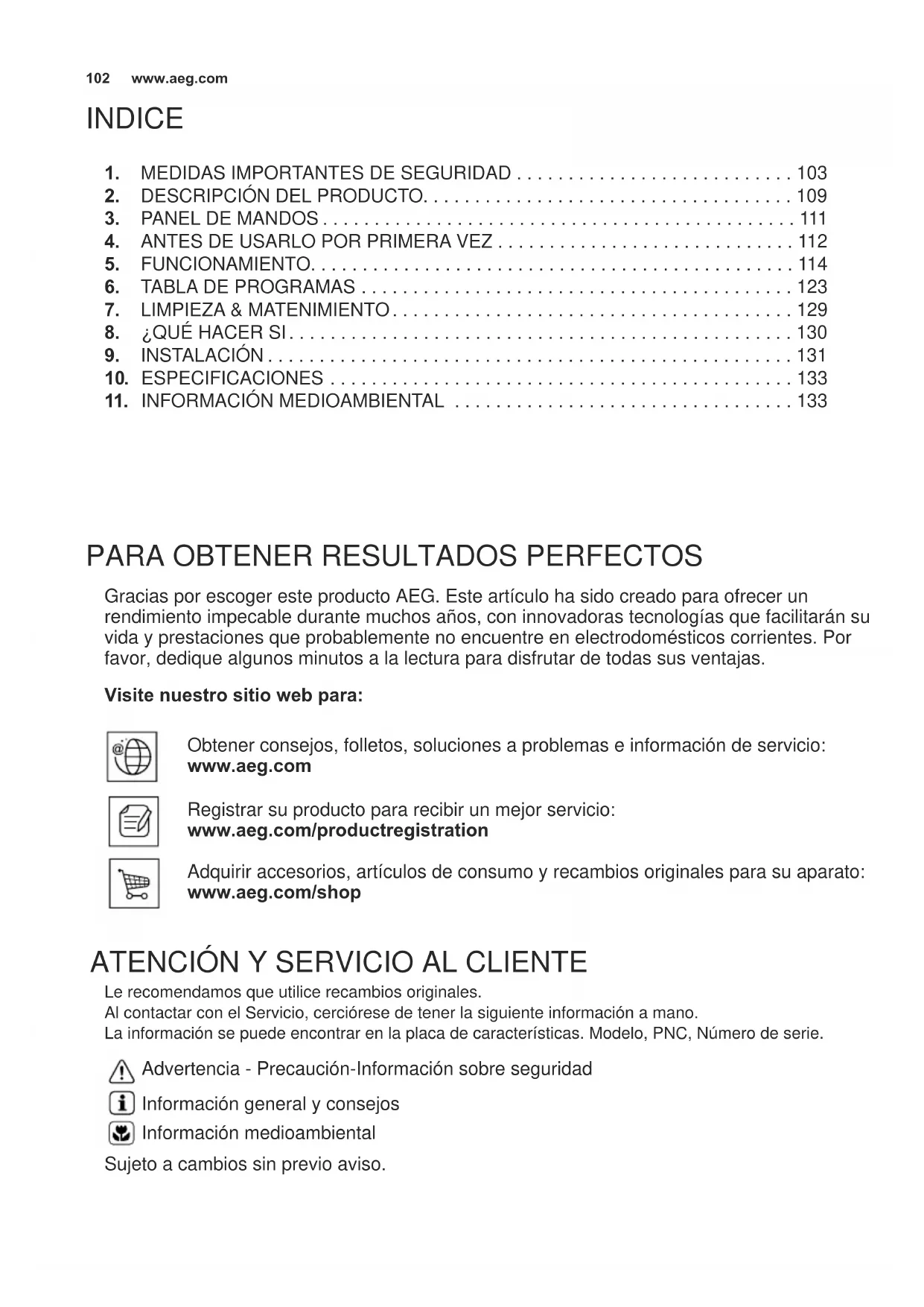 Le recomendamos que utilice recambios originales. Al contactar con el Servicio, cerciórese de tener la siguiente información a mano. La información se puede encontrar en la placa de características. Modelo, PNC, Número de serie. Sujeto a cambios sin previo aviso. Advertencia - Precaución-Información sobre seguridad Información general y consejos Información medioambiental Obtener consejos, folletos, soluciones a problemas e información de servicio: www.aeg.com Registrar su producto para recibir un mejor servicio: www.aeg.com/productregistration Adquirir accesorios, artículos de consumo y recambios originales para su aparato: www.aeg.com/shop 4_AEG_Spanish_MG_AF14_Layout 1 13/04/2015 15:51 Page 102103 ESPAÑOL