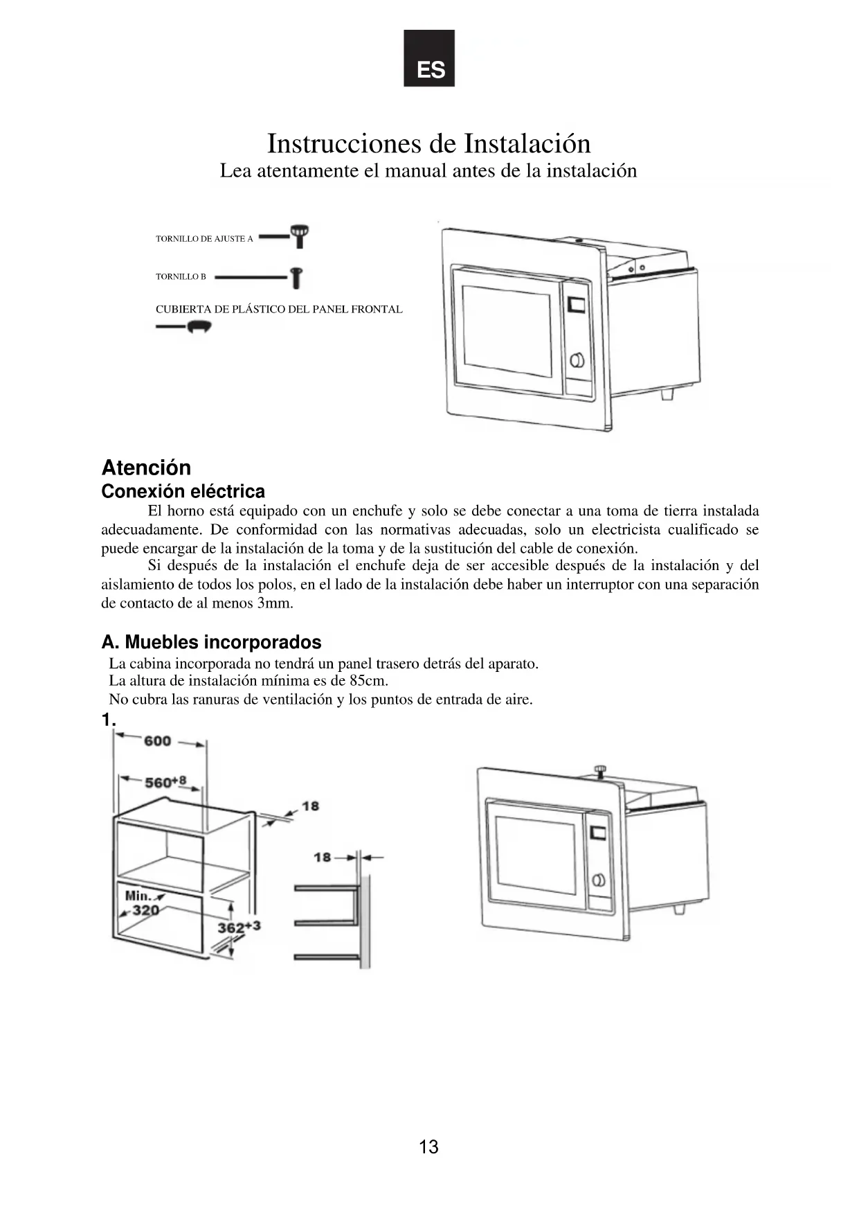 Atención Conexión eléctrica El horno está equipado con un enchufe y solo se debe conectar a una toma de tierra instalada adecuadamente. De conformidad con las normativas adecuadas, solo un electricista cualificado se puede encargar de la instalación de la toma y de la sustitución del cable de conexión. Si después de la instalación el enchufe deja de ser accesible después de la instalación y del aislamiento de todos los polos, en el lado de la instalación debe haber un interruptor con una separación de contacto de al menos 3mm. A. Muebles incorporados La cabina incorporada no tendrá un panel trasero detrás del aparato. La altura de instalación mínima es de 85cm. No cubra las ranuras de ventilación y los puntos de entrada de aire.
