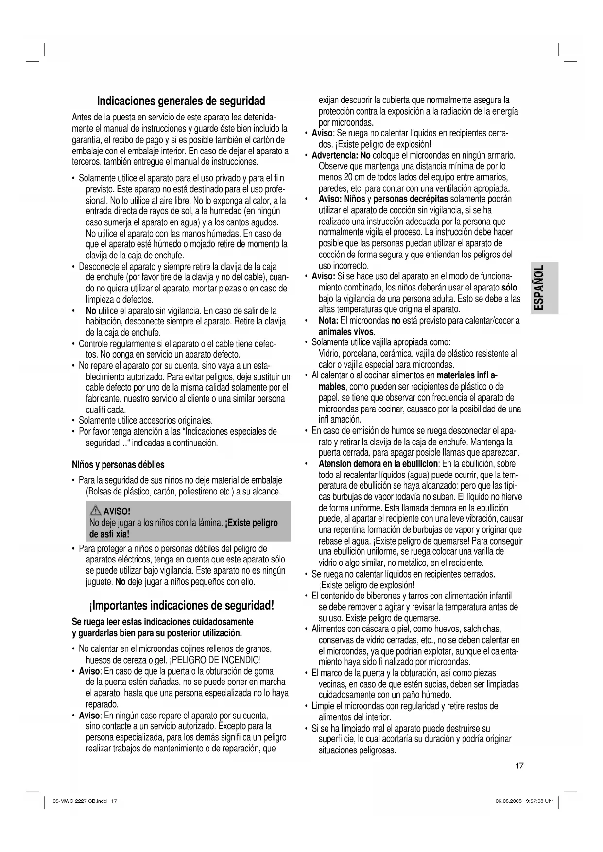 - Para recambiar la iluminación del horno diríjase por favor a un taller especializado en su cercanía. Datos técnicos Modelo:.................................................................. MWG 2227 CB Suministro de tensión:...............................................230 V, 50 Hz Consumo de energía: microondas: ................................................................ 1050 W parrilla: ........................................................................ 1000 W Potencia asignada de salida de microondas: ... 700 W/2450 MHz Volumen espacio de cocción: ..........................................17 Litros Clase de protección: .................................................................... Ι Peso neto: ........................................................................10,80 kg Este aparato se ha examinado según las normativas actuales y vigentes de la Comunidad Europea, como p.ej. compati- bilidad electromagnética y directiva de baja tensión y se ha construido según las más nuevas especifi caciones en razón de la seguridad. No reservamos el derecho de efectuar modifi caciones técnicas. Signifi cado del símbolo „Cubo de basura“ Proteja nuestro medio ambiente, aparatos eléctricos no forman parte de la basura doméstica. Haga uso de los centros de recogida previstos para la eliminaci- ón de aparatos eléctricos y entregue allí sus aparatos eléctricos que no vaya a utilizar más. Ayudará en evitar las potenciales consecuencias, a causa de una erronéa eliminación de desechos, para el medio ambiente y la salud humana. Con ello, contribuirá a la recuperación, al reciclado y a otras formas de reutilización de los aparatos viejos eléctricos y electrónicos. La información cómo se debe eliminar los aparatos, se obtiene en su ayuntamiento o su administración municipal. 05-MWG 2227 CB.indd 2005-MWG 2227 CB.indd 20 06.08.2008 9:57:09 Uhr06.08.2008 9:57:09 Uhr21 PORTUGUÊS PORTUGUÊS Instruções gerais de segurança Antes de pôr este aparelho a funcionar, leia muito atentamente as instruções de emprego e guarde-as muito bem, juntamente com o talão de garantia, o talão de compra e, tanto quanto possível, a embalagem com os elementos interiores. Se puser o aparelho à disposição de terceiros, entregue-lhes também as Instruções de Utilização.