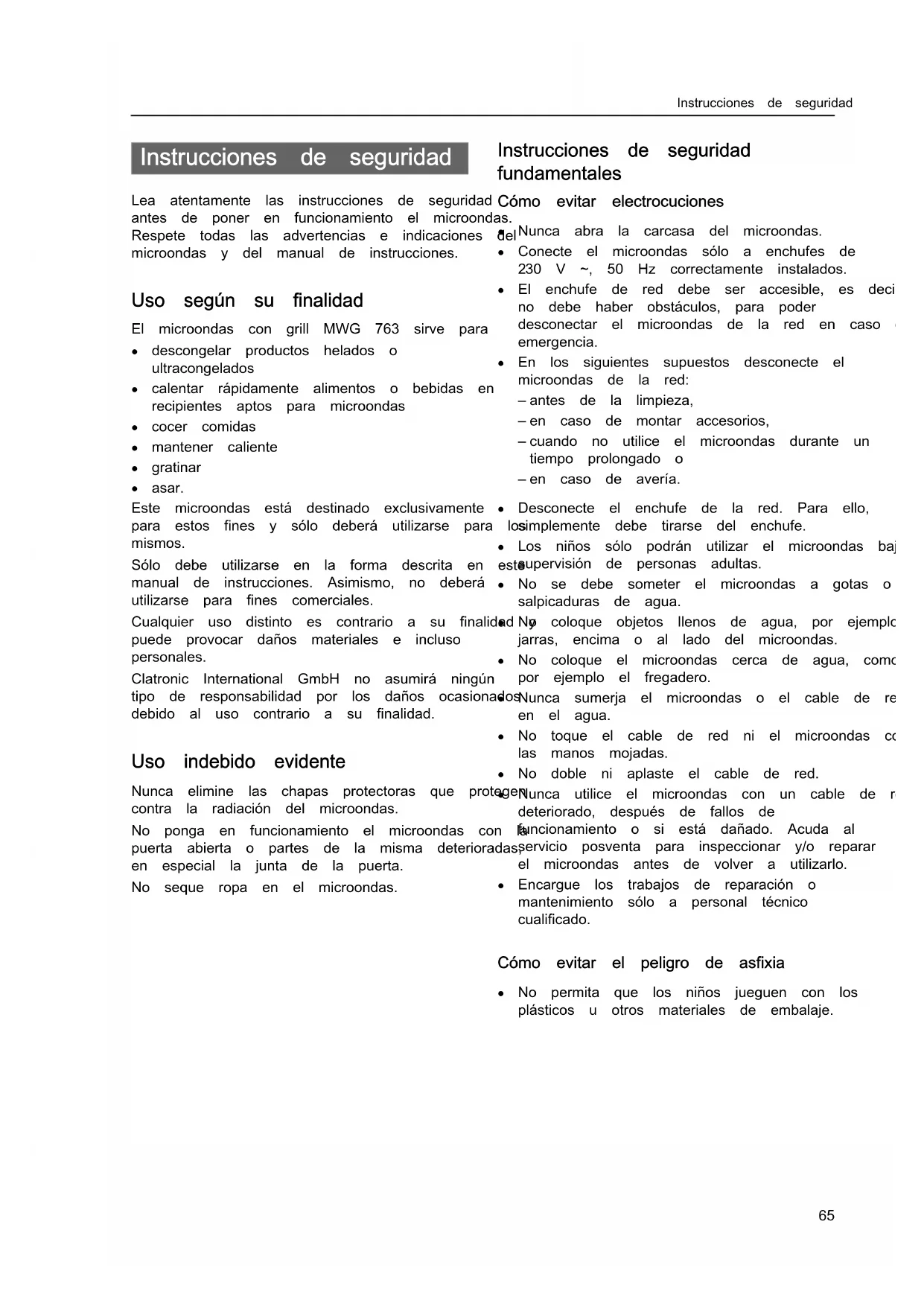 Instrucciones de seguridad Lea atentamente las instrucciones de seguridad antes de poner en funcionamiento el microondas. Respete todas las advertencias e indicaciones del microondas y del manual de instrucciones. Uso según su finalidad El microondas con grill MWG 763 sirve para