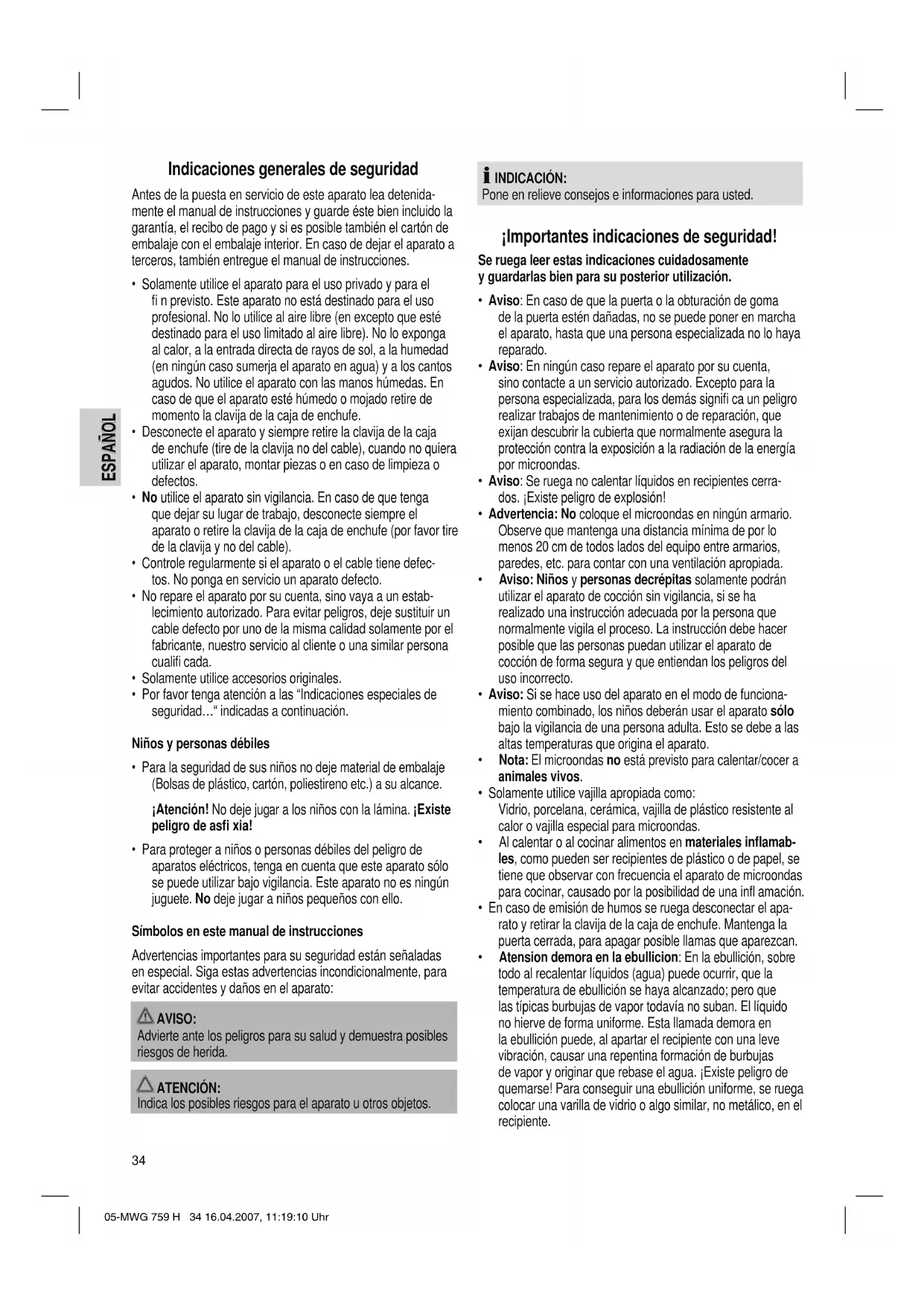 - Atension demora en la ebullicion: En la ebullición, sobre todo al recalentar líquidos (agua) puede ocurrir, que la temperatura de ebullición se haya alcanzado; pero que las típicas burbujas de vapor todavía no suban. El líquido no hierve de forma uniforme. Esta llamada demora en la ebullición puede, al apartar el recipiente con una leve vibración, causar una repentina formación de burbujas de vapor y originar que rebase el agua. ¡Existe peligro de quemarse! Para conseguir una ebullición uniforme, se ruega colocar una varilla de vidrio o algo similar, no metálico, en el recipiente. 05-MWG 759 H 34 16.04.2007, 11:19:10 UhrESPAÑOL