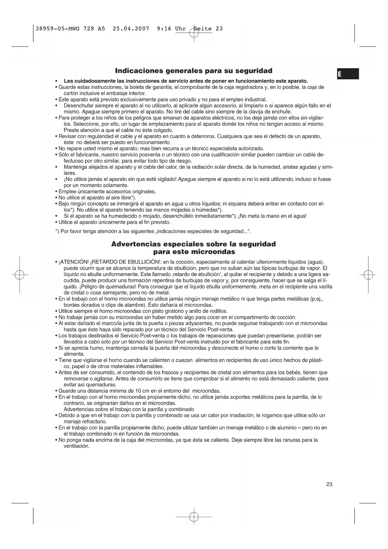 - No ponga nada encima de la caja del microondas, ya que ésta se calienta. Deje siempre libre las ranuras para la ventilación. 38959-05-MWG 728 A5 25.04.2007 9:16 Uhr Seite 2324