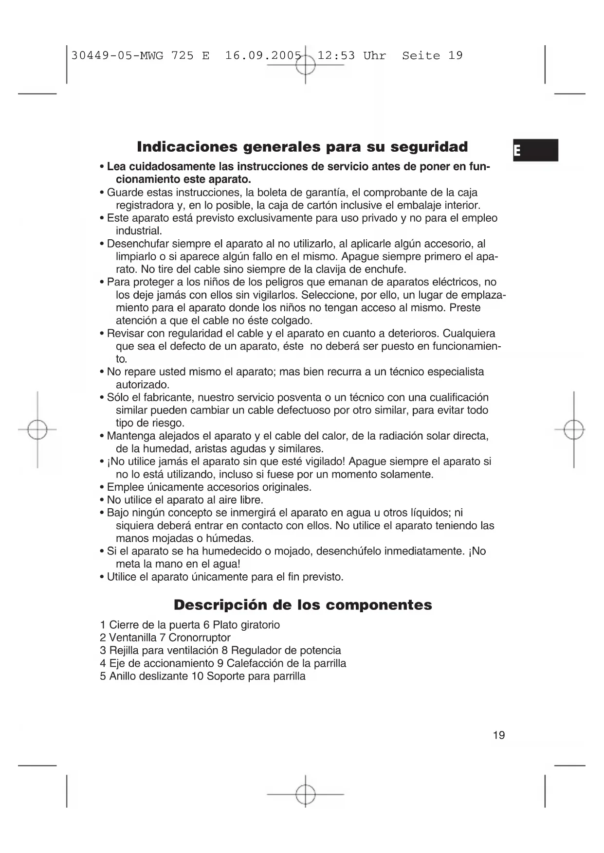 30449-05-MWG 725 E 16.09.2005 12:53 Uhr Seite 19Advertencias especiales sobre la seguridad para este microondas