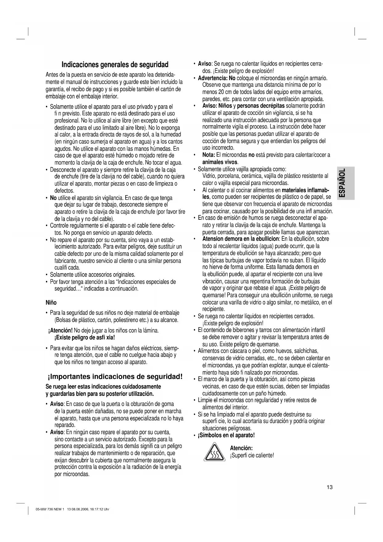 - Limpie la ventana por afuera y por adentro con un paño húmedo y elimine con regularidad las salpicaduras y las manchas de los líquidos derramados. 05-MW 736 NEW 1 14 08.08.2006, 16:17:15 UhrESPAÑOL